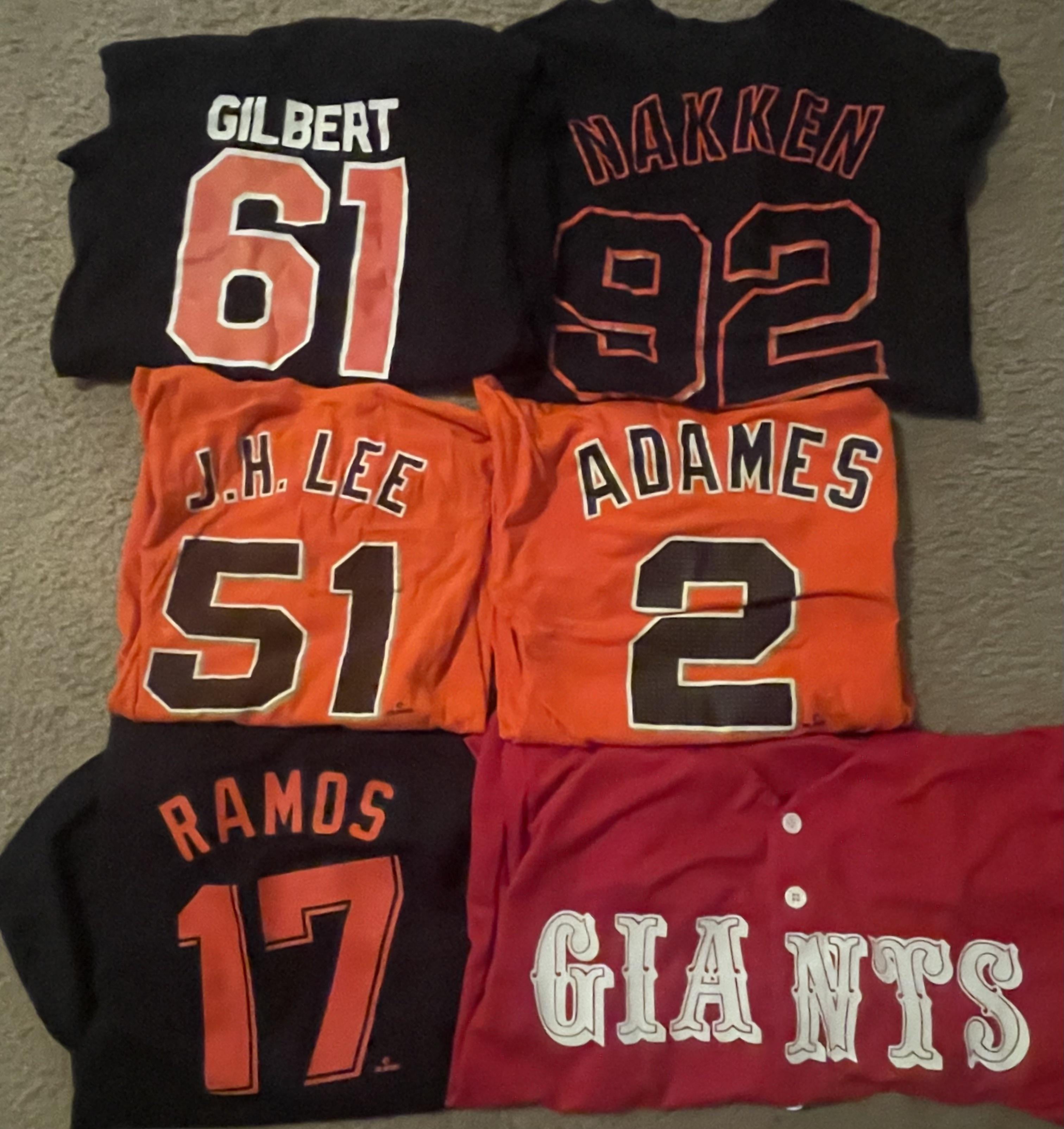 I’ve taken my daughter to Giants games since she was 1, but this year she really got into the game and started collecting shirts and jerseys. These are the ones she got just this season.
