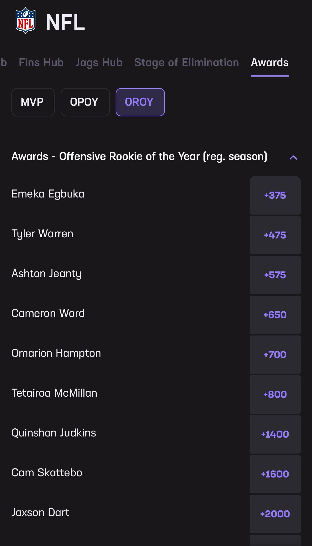 1. awesome to see, i think he’s absolutely earned it to this point. i do think it’s also worth noting that he’s helped by there not really being any other standouts to this point in the season, all the other favorites have been pretty stale in terms of production (cam, jeanty, etc)