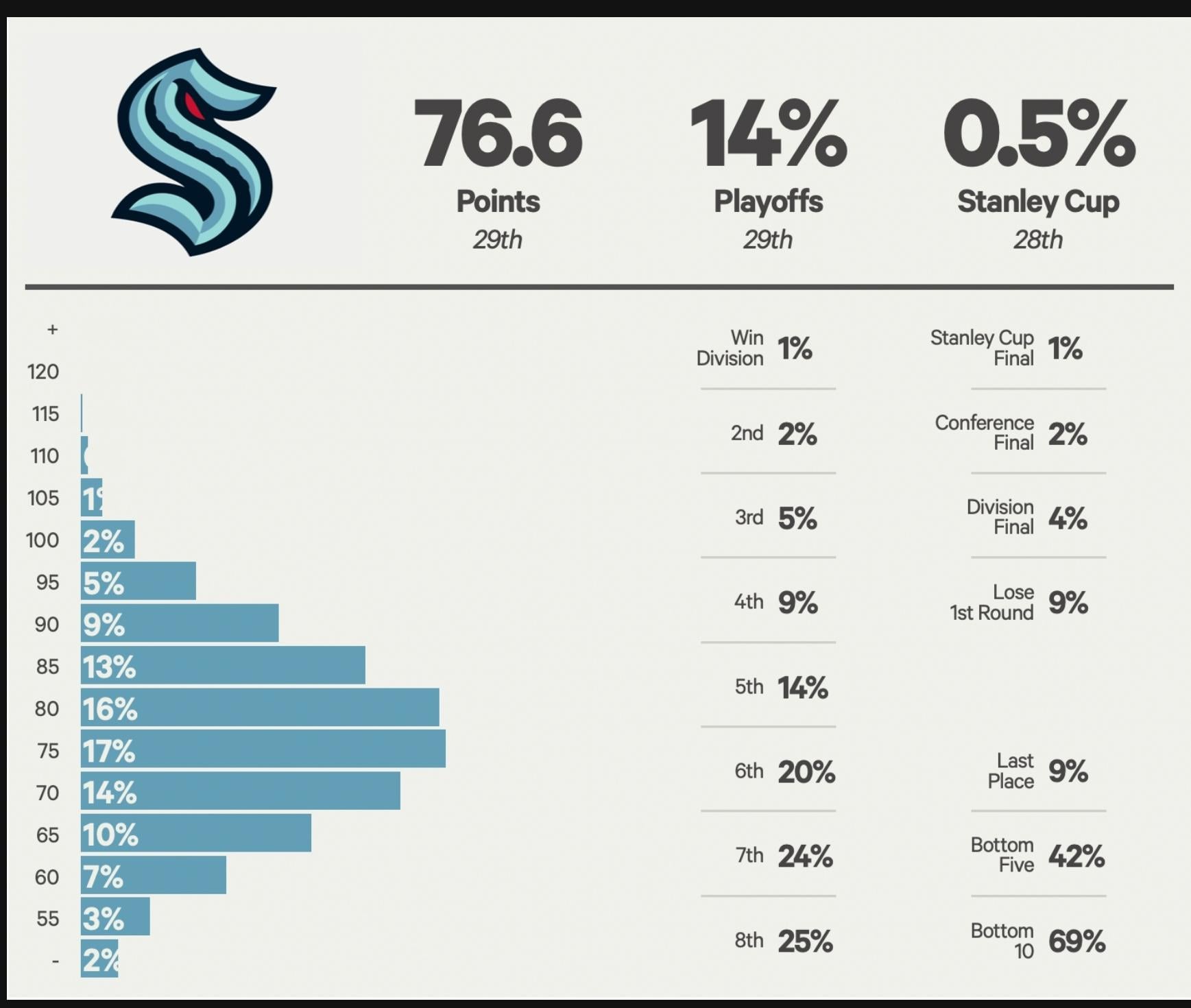 Kraken are projected to be 4th worst in the NHL, behind only the Hawks, Sharks, and Pens and just ahead of the Preds.