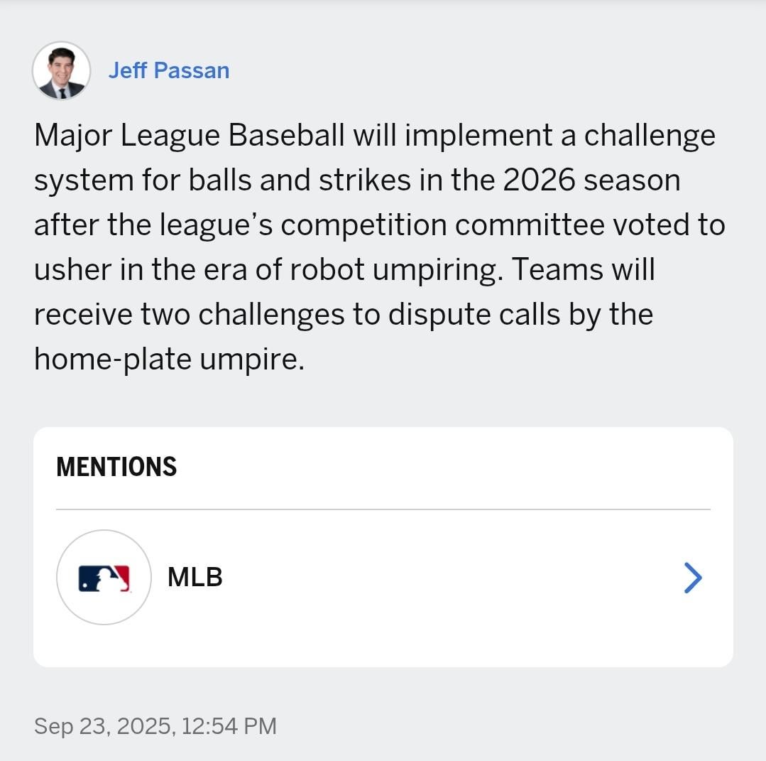 Balls and strikes challenging starting in 2026 5 comments W They have the tech to completely eliminate the umpires, it’s like a ceremonial role at this point. Thank fuck. Cannot wait. I’ve watched this in the minors and I think it works really well. It’s less than a minute and the umps are usually 50/50 with the close calls Only 2 huh? The opportunity to retain the right to challenge seems more appropriate if the umpire misjudges Leave a ReplyYou must be logged in to post a comment.