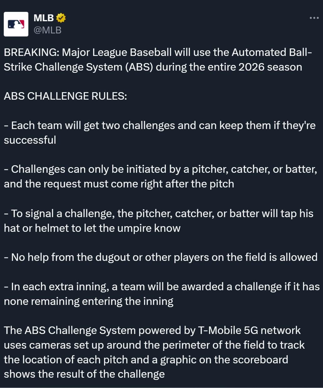MLB will use Automated Ball-Strike Challenge System (ABS) during the entire 2026 season