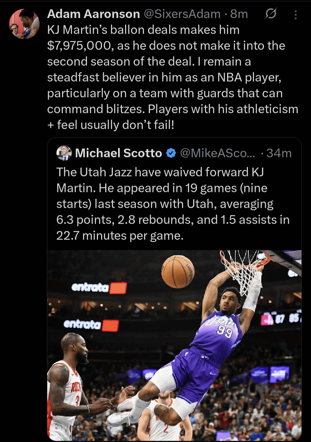Nah. Obviously KJ is not his father, but it rubbed me the wrong way that Kenyon Martin would regularly shit on Embiid on Gilbert Arenas’ podcast while he was on the team. I want this team to have a healthy dynamic for once with as little outside noise as can be had by a major market team with a controversial superstar at its helm.