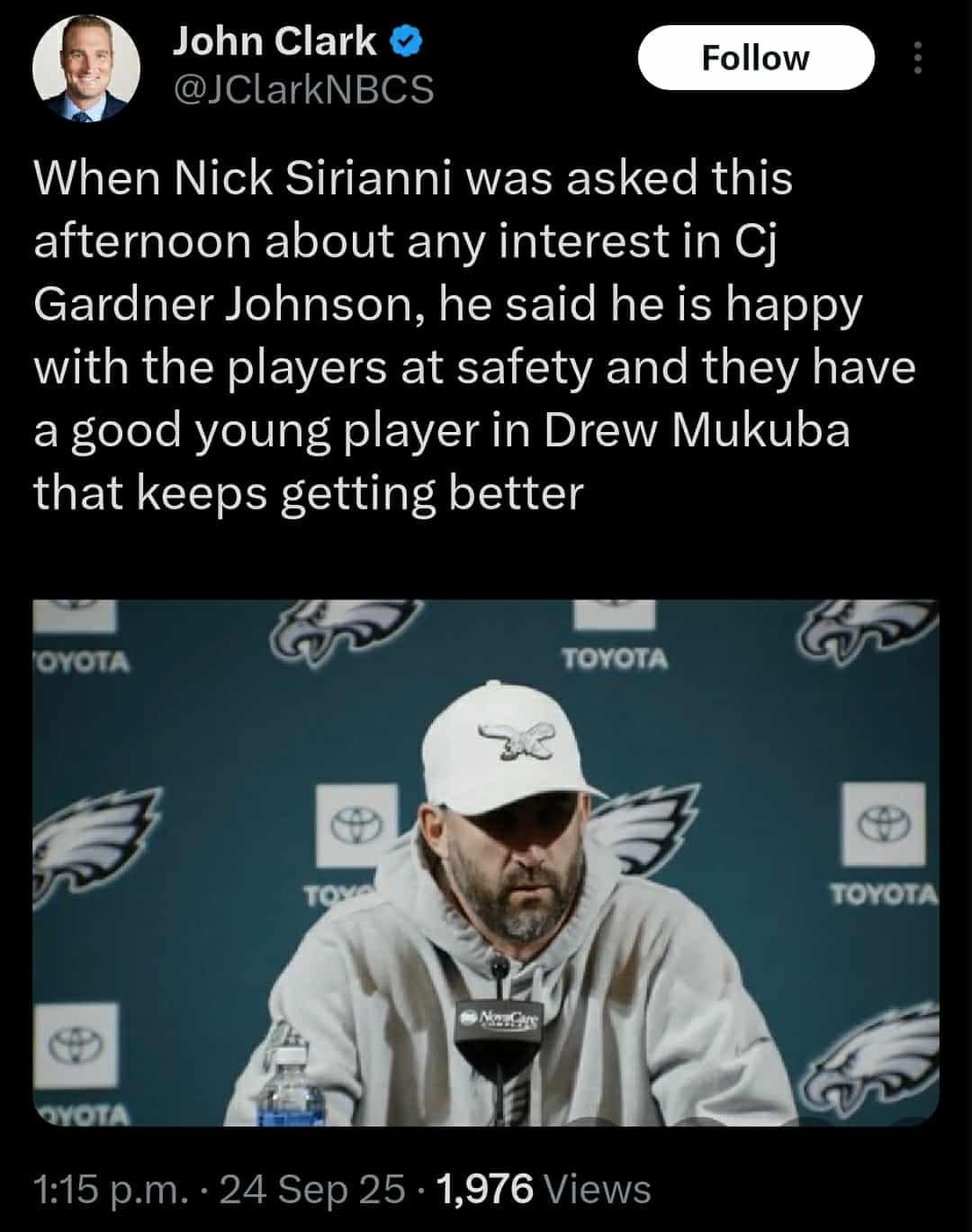 [Clark] When Nick Sirianni was asked this afternoon about any interest in Cj Gardner Johnson, he said he is happy with the players at safety and they have a good young player in Drew Mukuba that keeps getting better