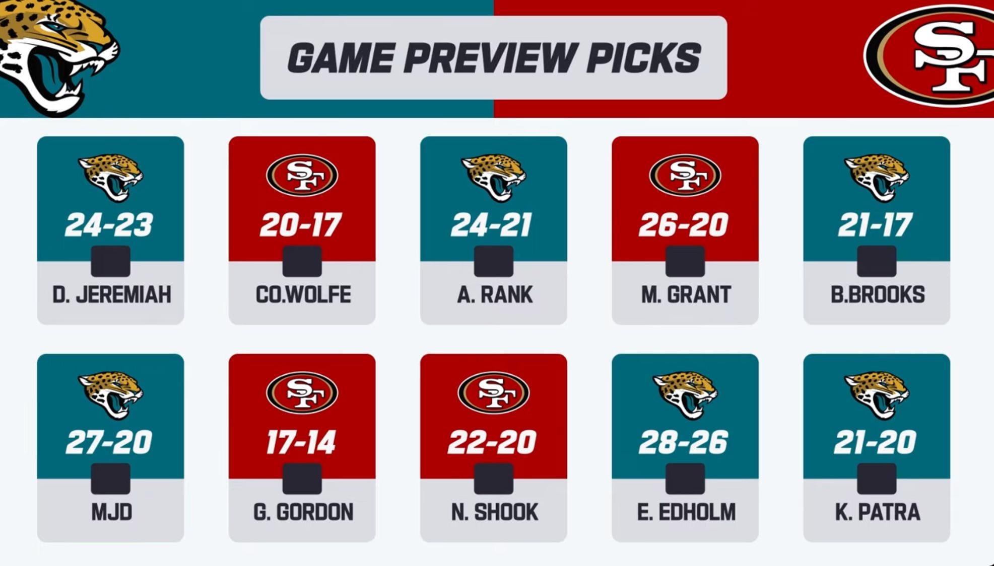 1. 41-25, jags finally put it together on both sides of the ball. STATEMENT game for the jags and they win BIG. Media will say 49ers missing too many players.