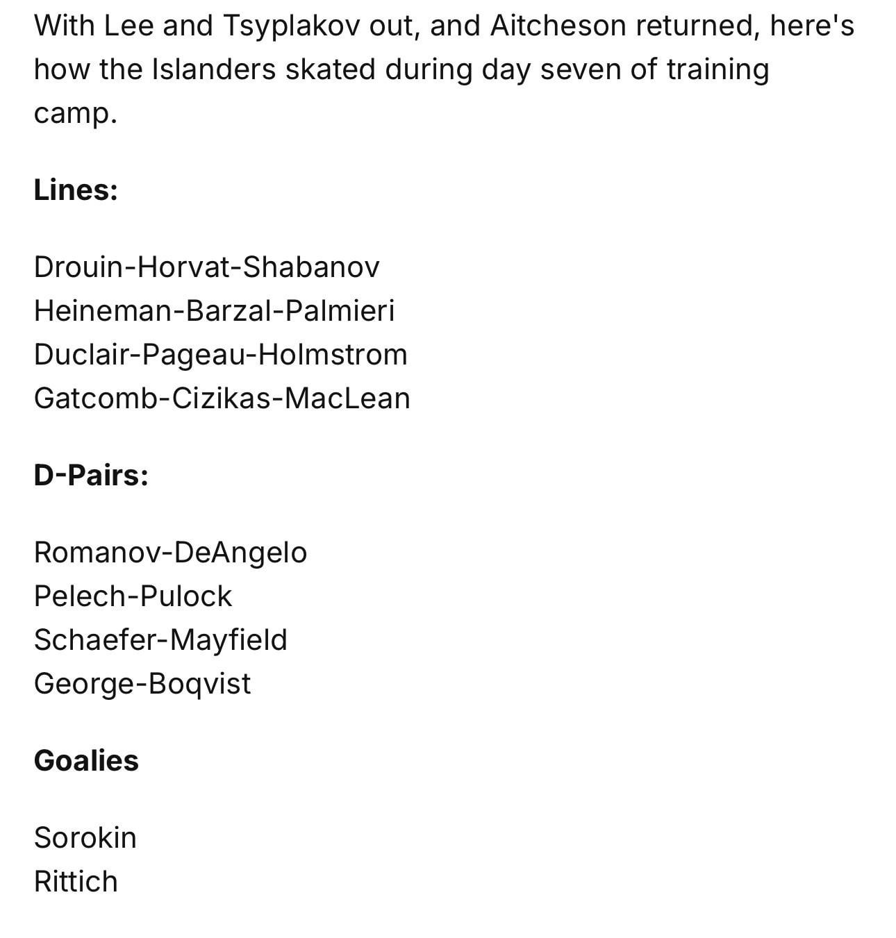 Islanders Lines from Today with Lee and Tsyplakov out