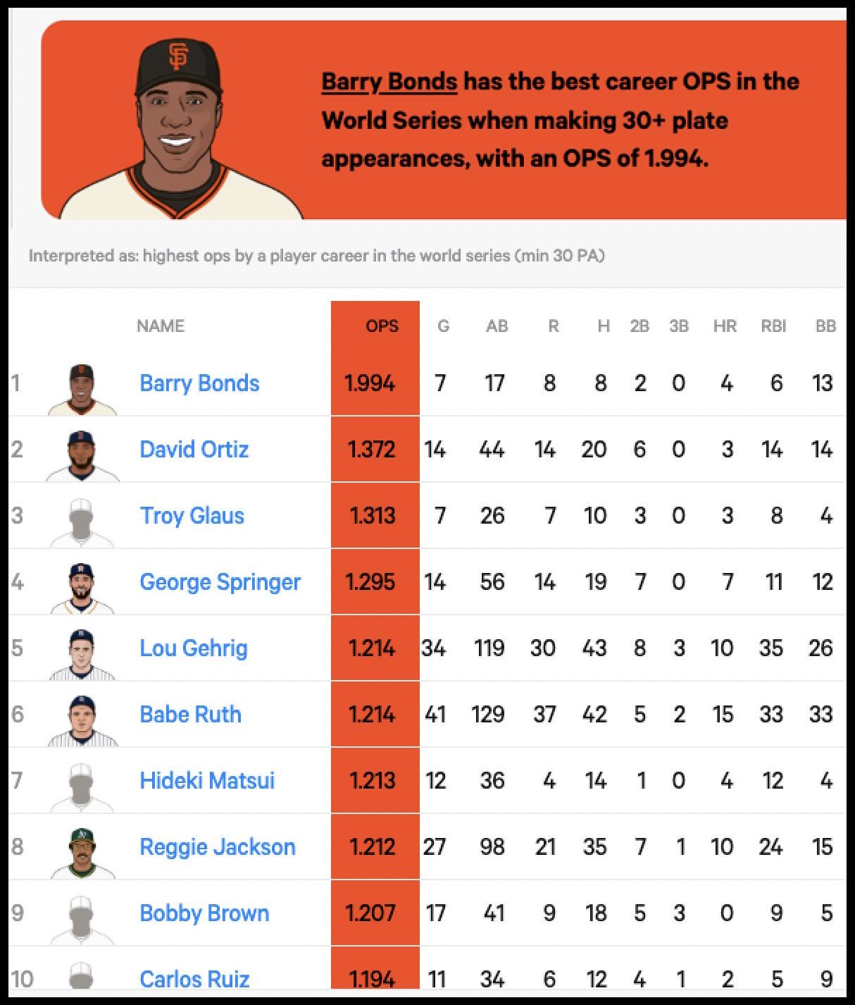 Remember when people said Barry Bonds couldn’t hit in the postseason? And then he had the best WS ever. He’s the best WS in history and it’s not close