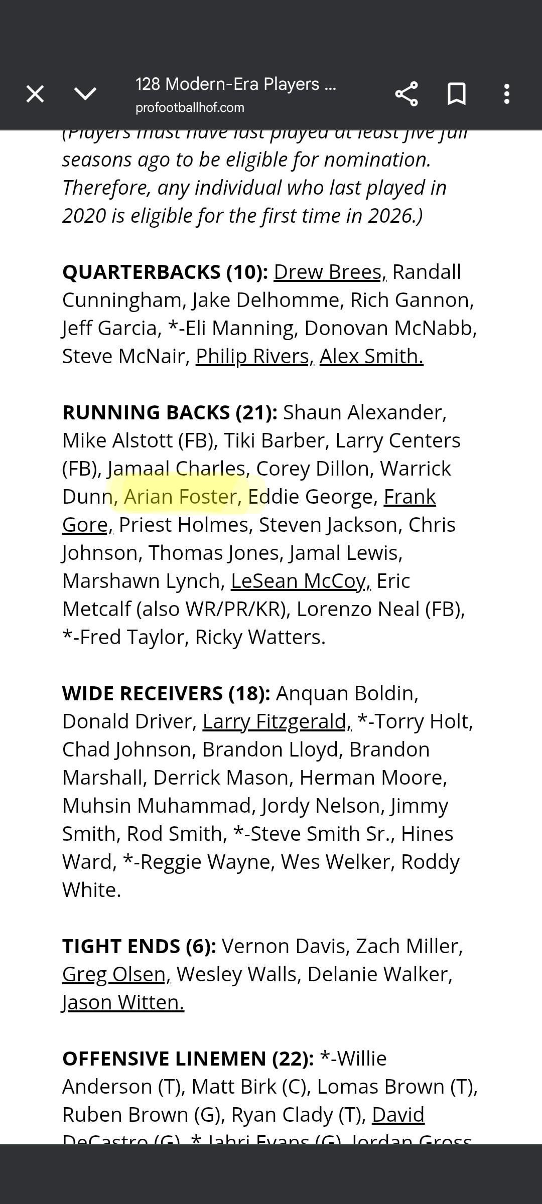 4. Much as I love foster, even in that class of nominees he’s not in the top 3 running backs. I sincerely doubt he gets in. Needed more productive years.