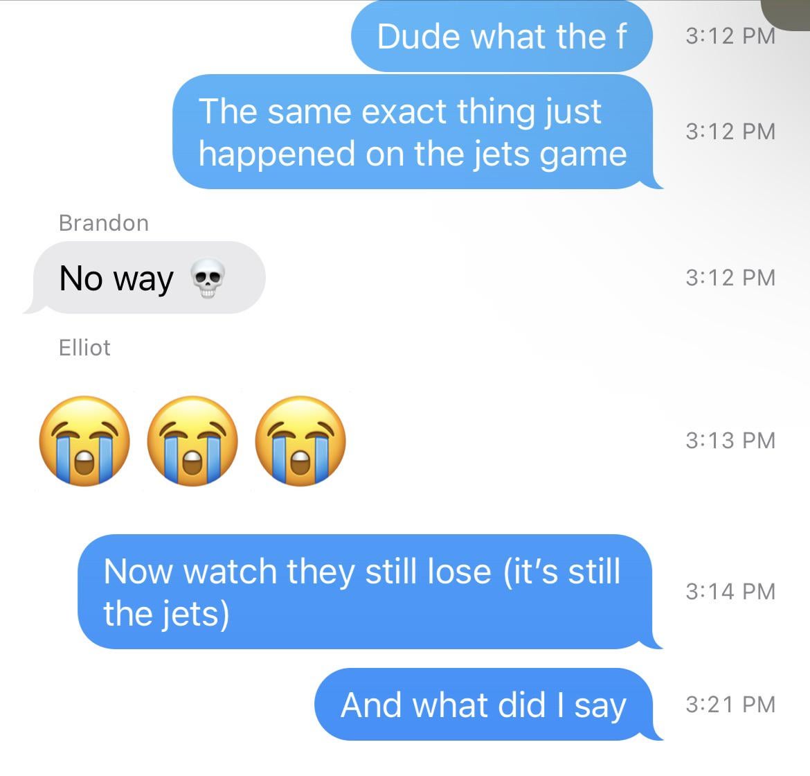 5. I called the halftime pick 6 as soon as they called the timeout on defense and I called the loss with 2 minutes left after the block return. same as the Steelers game. If you’re a jets fan long enough you know exactly what to expect. This team lacks free will because I already know the outcome