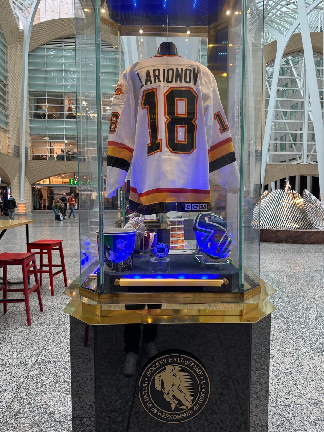 Was in Toronto for a conference and saw this in the mall. All the Canadian teams had a player memorialized 5 comments Curt Ridley’s mask. Wonder what the white gloves are from? They wore maroon gloves for the outdoor game… That is random collection of equipment. HOF popcorn bucket Vancouver should have never let him get away Leave a ReplyYou must be logged in to post a comment.