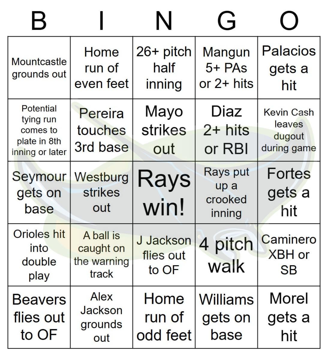 Rays vs Orioles Bingo, 9/25/2025