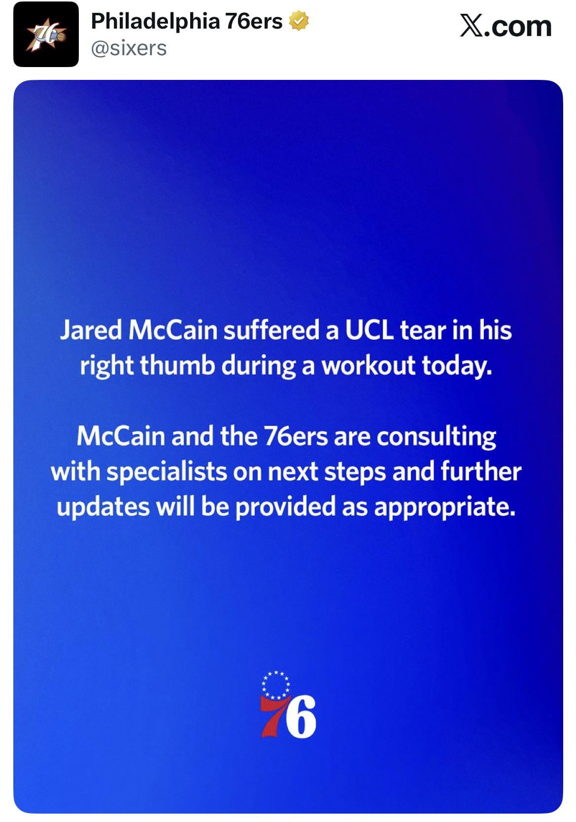 Bro all I asked for was no McCain, Maxey or VJ injuries 🤦🏽 McCain is now on the path to be labeled as injury prone