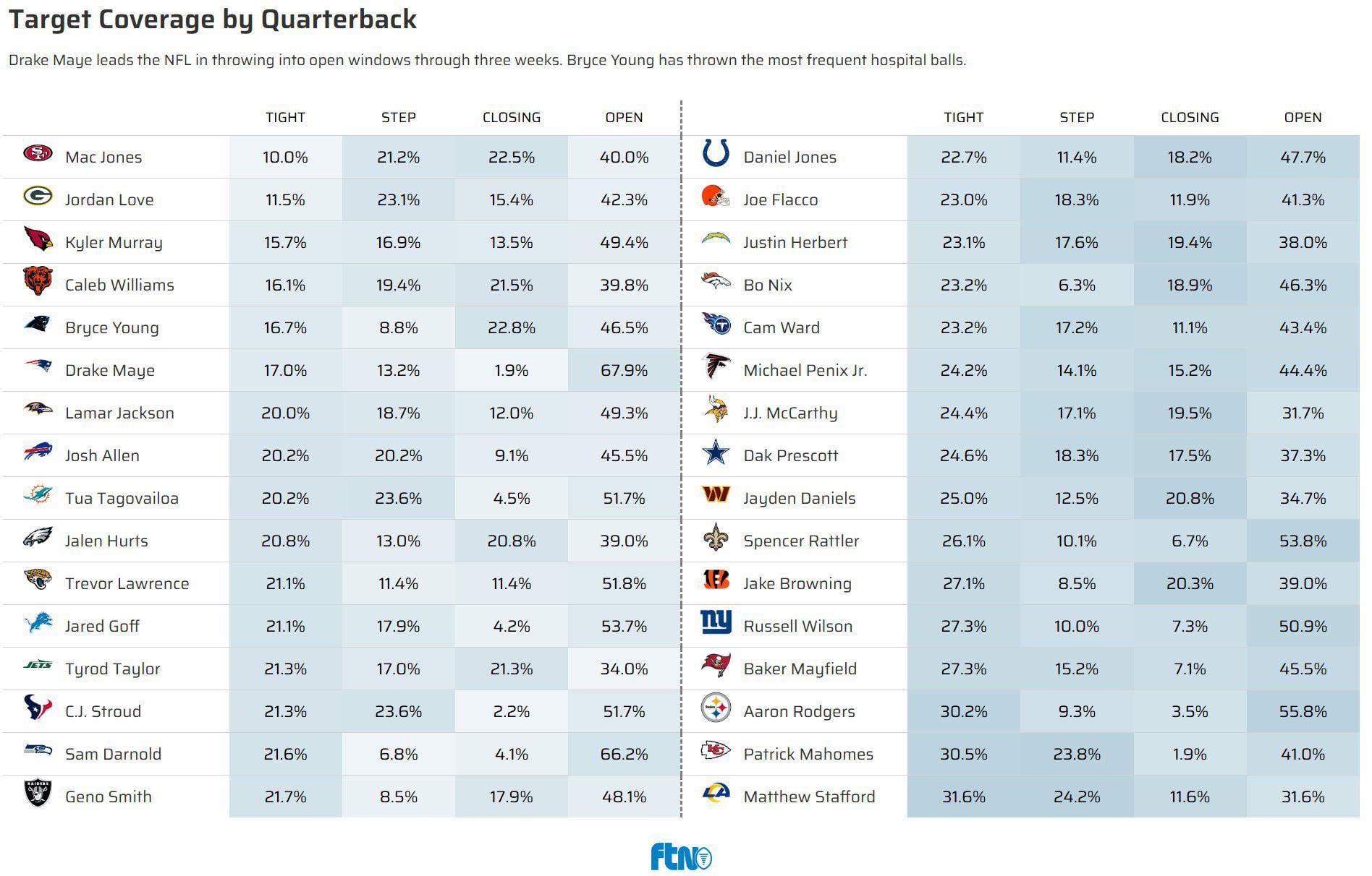 Drake Maye throws into more open windows than any other QB in the league. Josh McDaniels is cooking.
