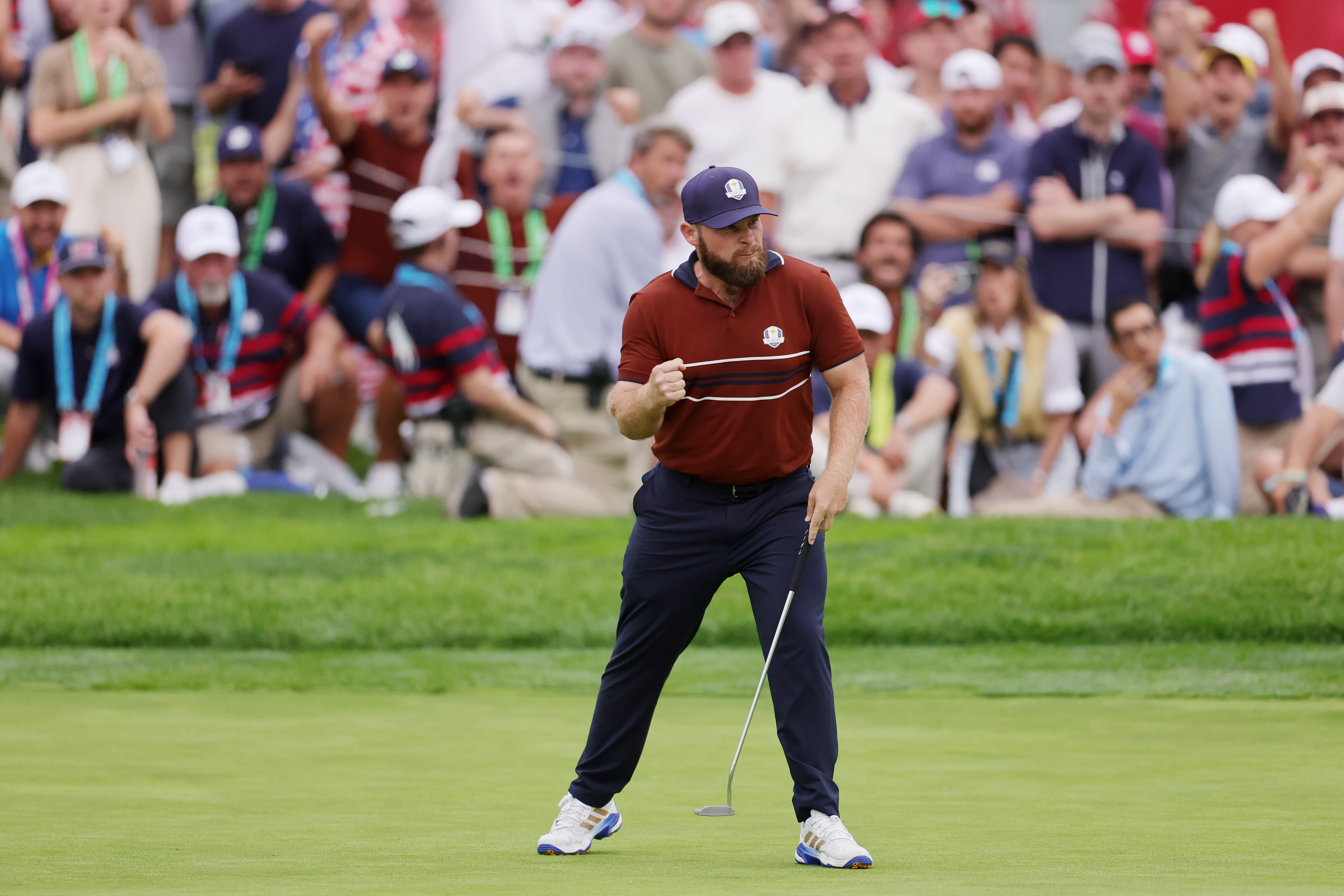Billiards on the 18th from the Europeans in the final match. From the bunker on 18, Fitzpatrick digs out a shot not dissimilar to the famous one in his 2023 US Open triumph. Spins it and it rolls back to within a couple of feet of the hole.