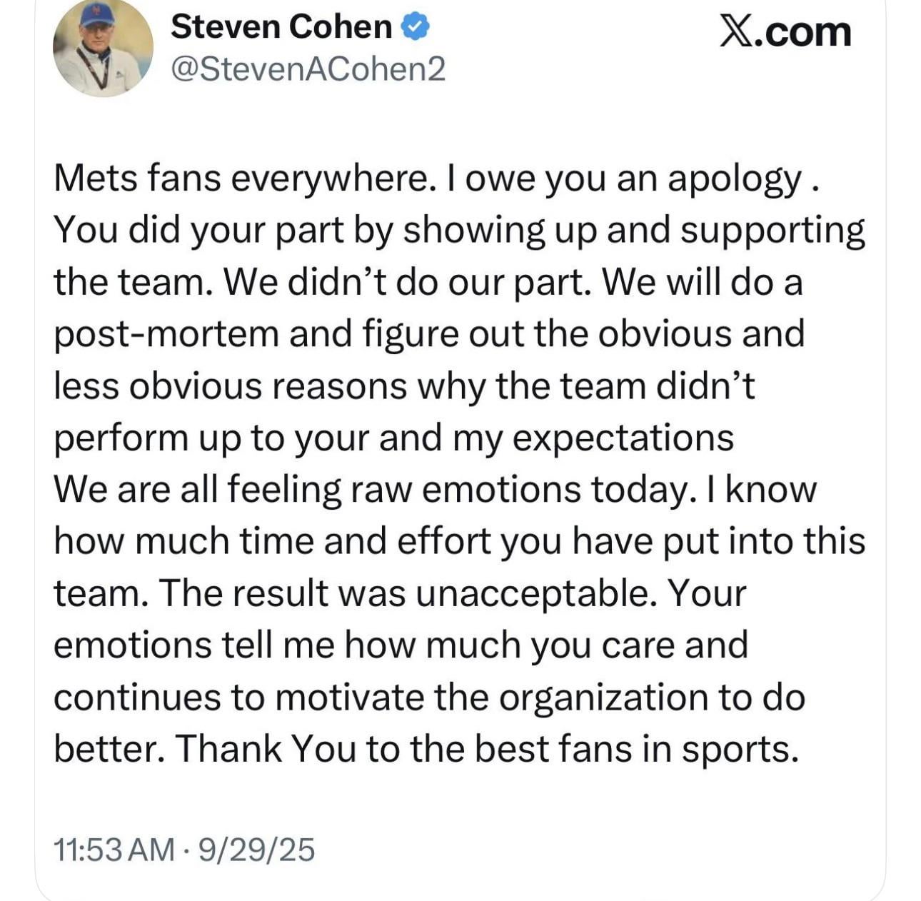 Obviously the ending of the Mets season was a disaster. But I respect the hell out of Cohen for sending fans a message like this!