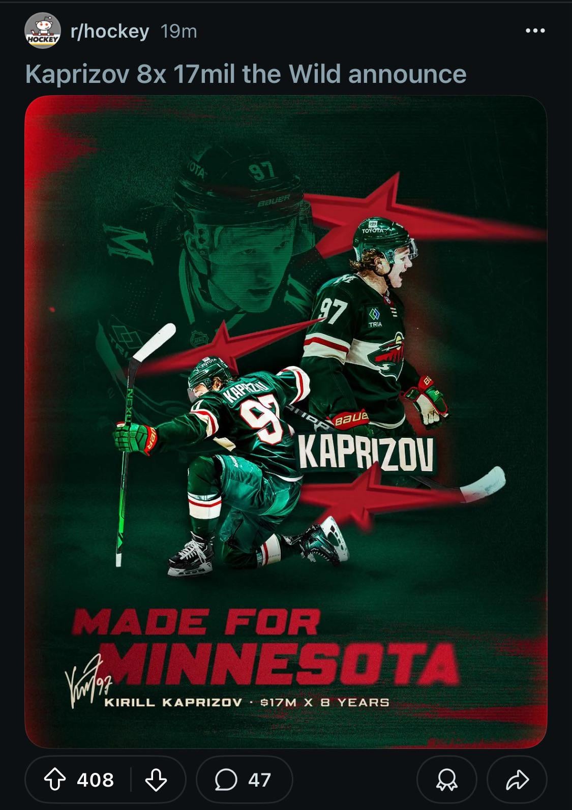 Kaprizovs signing is very much not a deal, but you have to pay your superstars. Hughes has more impact than Kaprizov so I won’t complain no matter what.