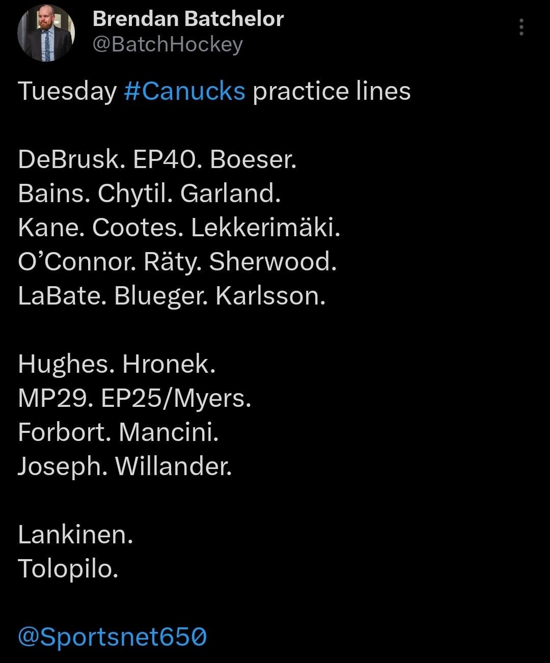 I’m not sure about DeBrusk and Boeser on the same line but I think it has to happen. Lekk will be our long term 2RW and if DeBrusk doesn’t work with Petey and Boeser he certainly won’t work with Chytil/Cootes/whoever we trade for and Lekk.