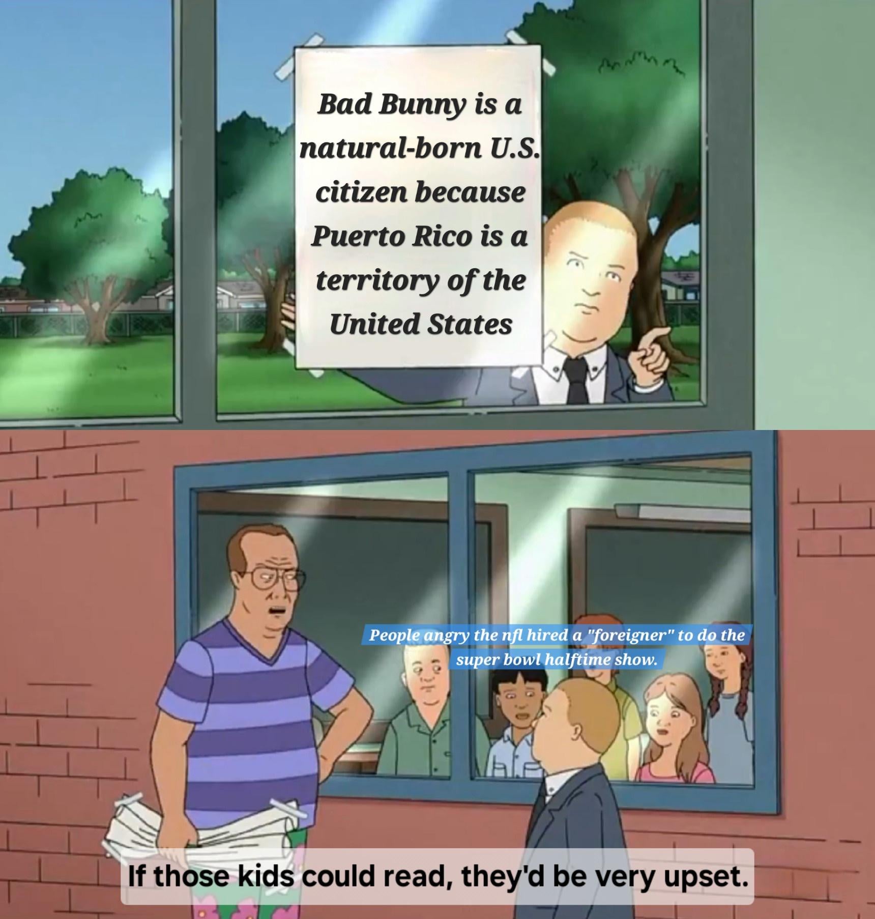 I think the people upset by this are the ones that yearn for the return of Creed with winged men flying around on wires. Which I wouldn’t complain about, but I’m also not gonna complain about Bad Bunny either. Halftime is when I pee, crush whatever’s left of the deviled eggs and gripe about how it’s taken 4 hours to play 30 min of football.