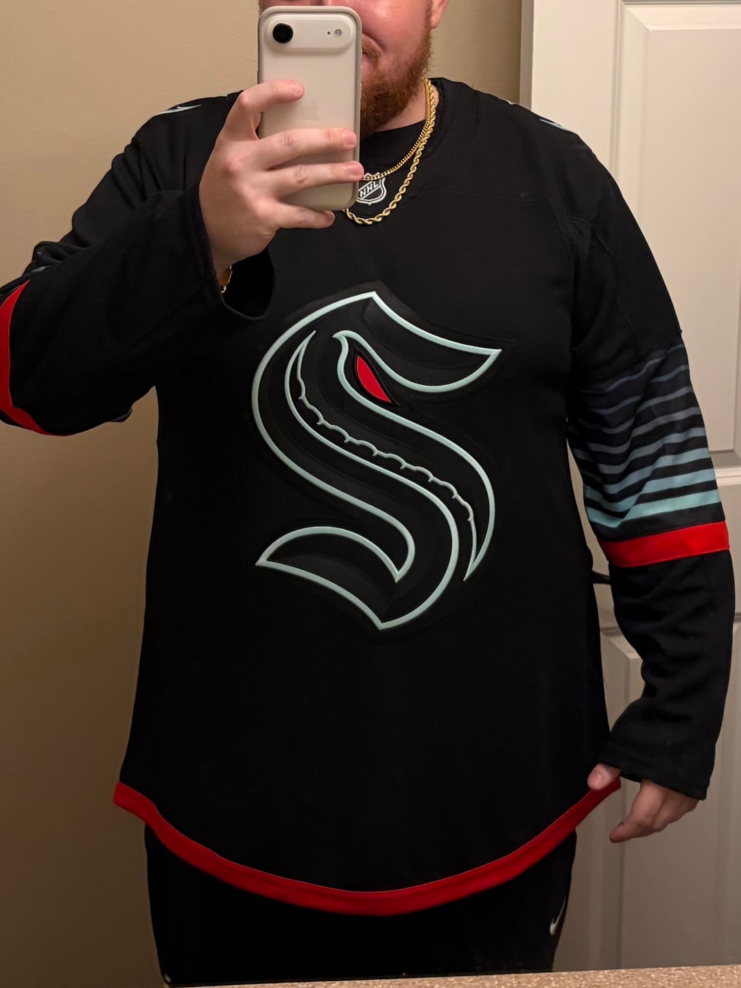 1. I got mine in today also! However, some parts of the lettering didn’t attach to the jersey. I’ll have to see if they’ll heat press it again at the arena next week. It’s awesome looking though!