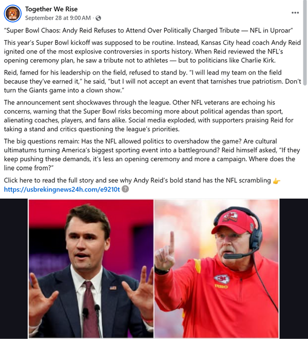In late September 2025, Facebook posts claimed that Kansas City Chiefs Head Coach Andy Reid said he would refuse to attend the 2026 Super Bowl over a planned tribute to slain conservative activist Charlie Kirk.