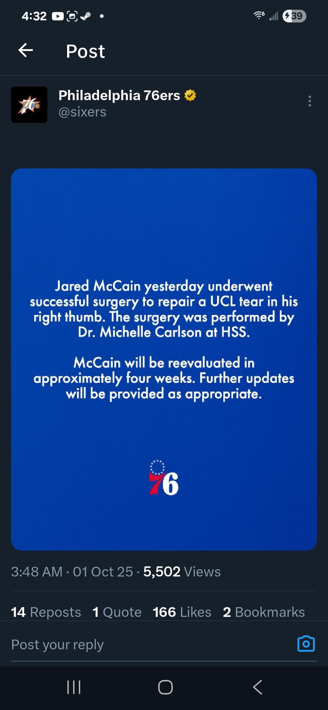 McCain will be re-evaluated in 4 weeks after successful surgery to repair a UCL tear in his right thumb 2 comments Hope that one guy can sleep now that we got the most expected tweet of all time. 3:48 AM news dump Leave a ReplyYou must be logged in to post a comment.
