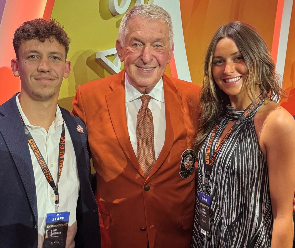 Anna Garvert (right) and Shay Milshteen (left) with Jerry Colangelo at Naismith Basketball Hall of Fame ceremonies in Springfield, Mass.