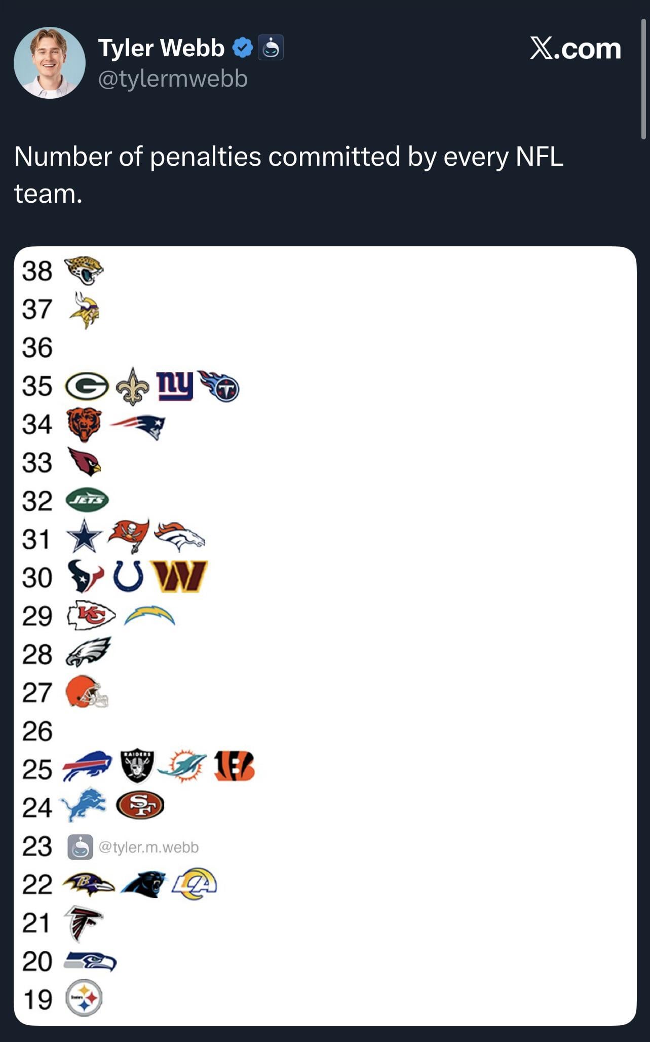 I do wonder how many of them as well are ‘important’ penalties from what we have have been penalised for too; as I think there has been 2 of them being delay of game before FG attempts trying to draw a penalty which would be a lot less costly in the outcome of results than some others.