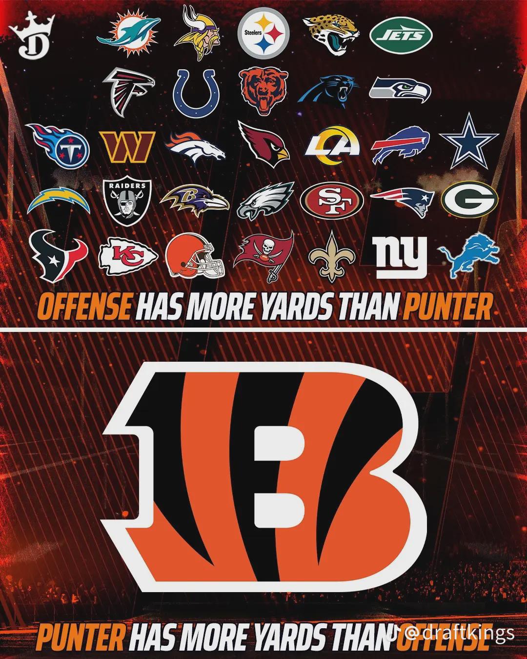 Other teams whose offenses have fewer yards than our punter: Saints, Vikings, Panthers, Texans, Dolphins, Browns, Cardinals, Steelers, Eagles, Titans