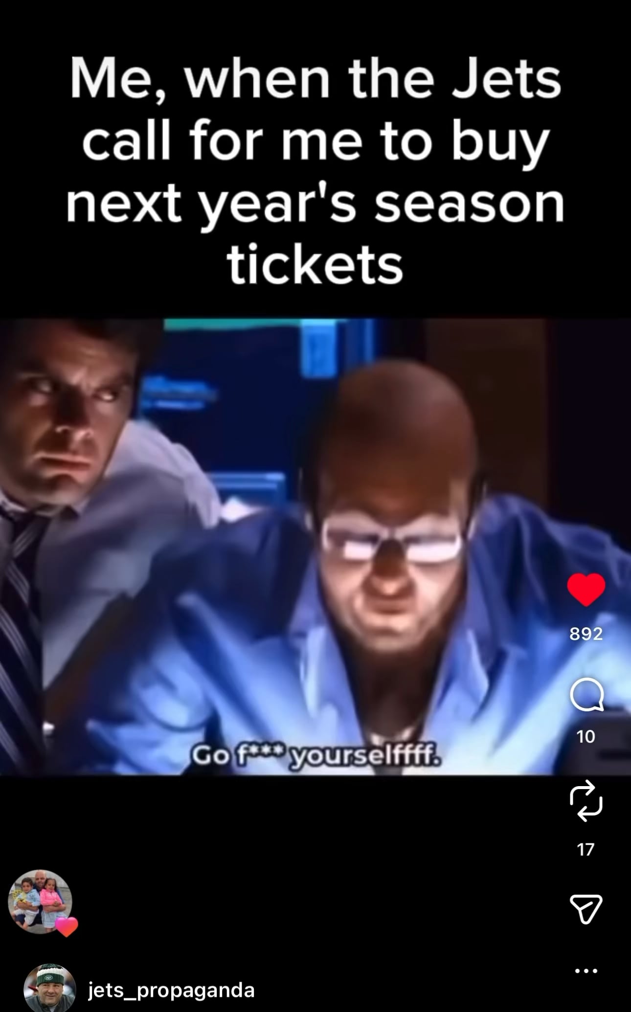 That usually is a funny conversation with me. Those poor fools who have to try to get fans to pay money to watch the Jets. You could give me 2 free tickets with a 50 wrapped around them and I wouldn’t take it to waste my Sunday watching this nonsense.
