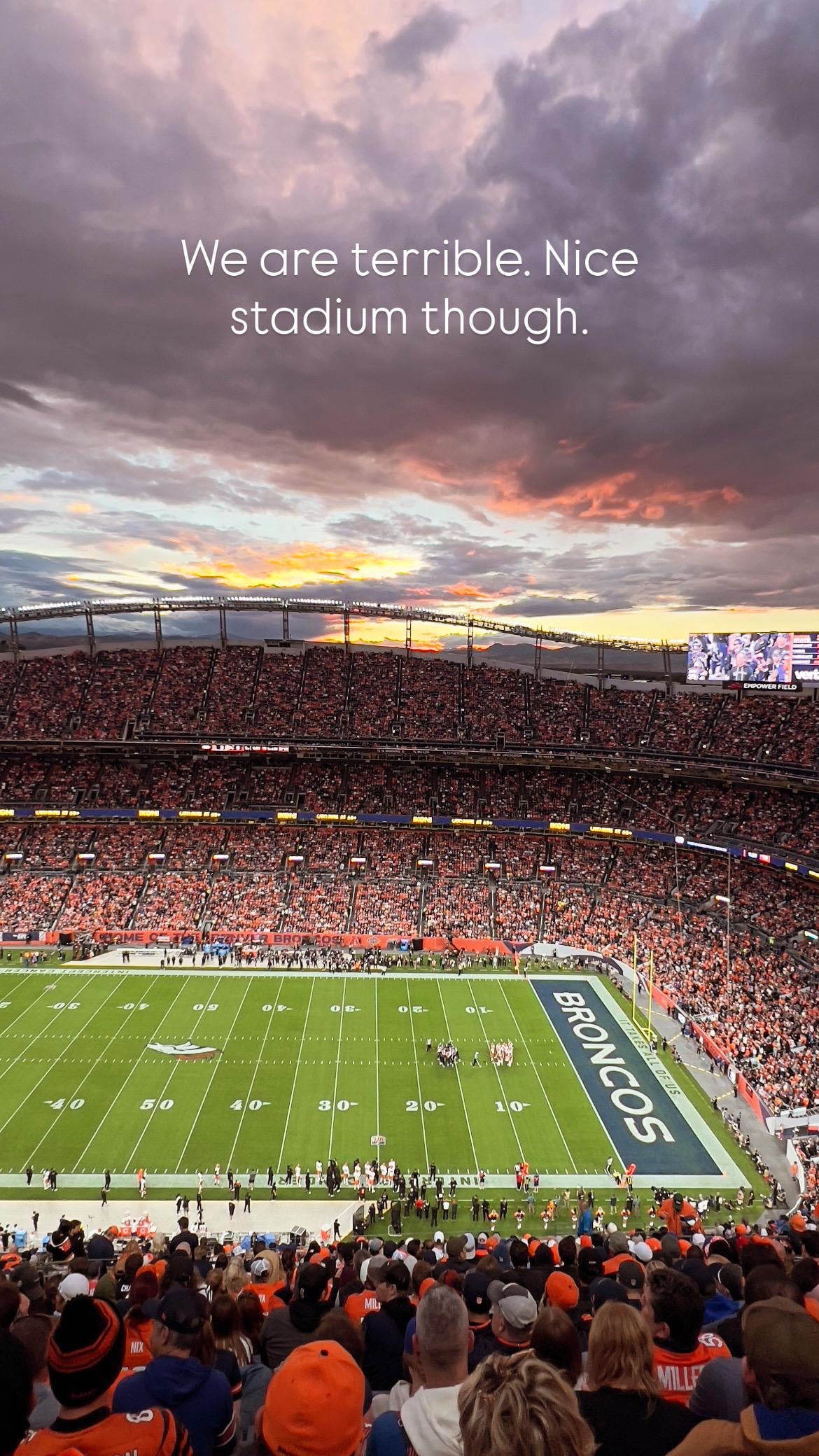 You sat in a great spot. It barely shows up in the picture, but those seats on that side of the stadium around sunset makes a beautiful scene with the mountain backdrop. Im sorry you didn’t get to see a win at Mile High like I did in 2021.