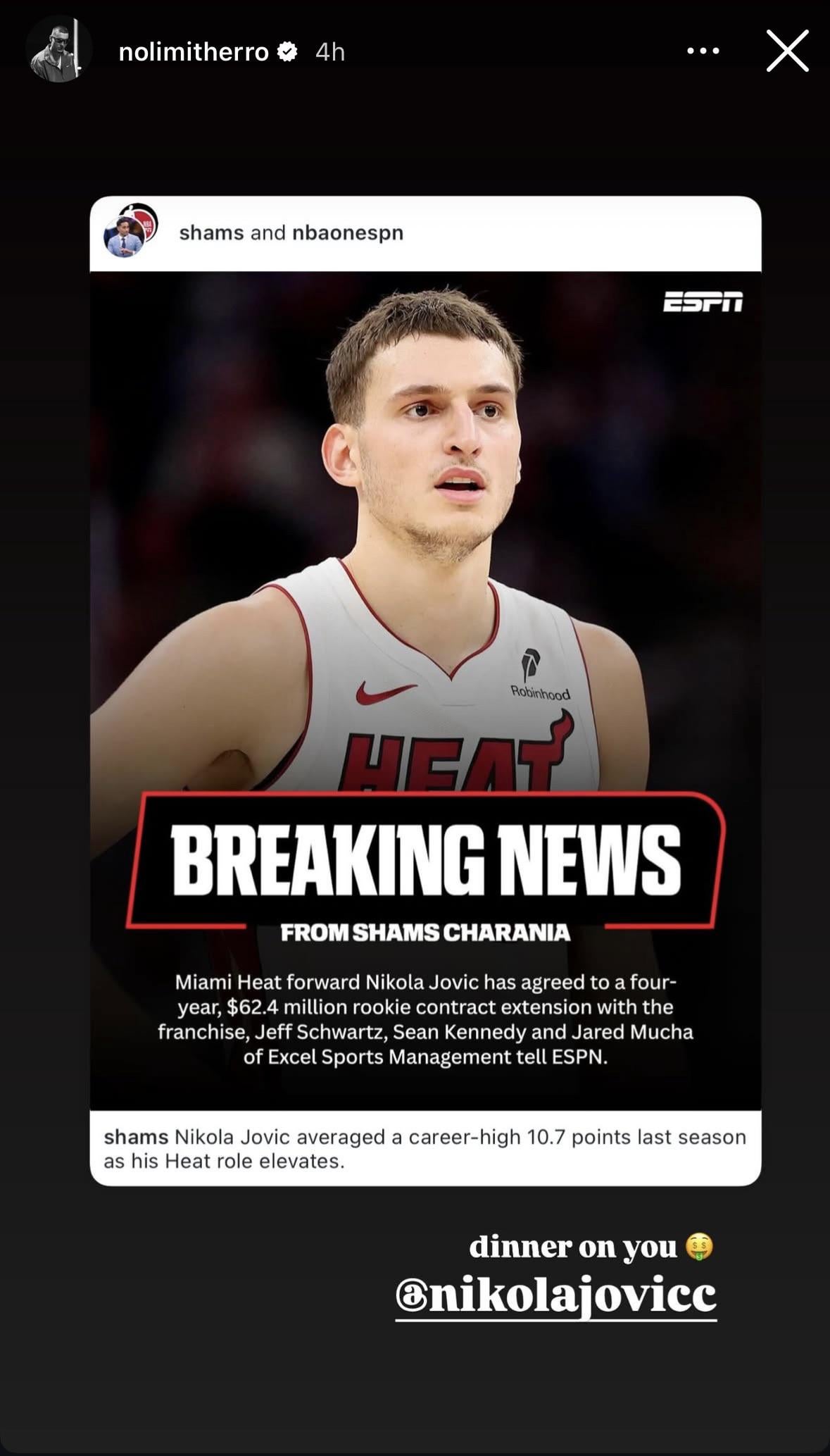 Herro via IG: “dinner on you 🤑 @nikolajovicc”