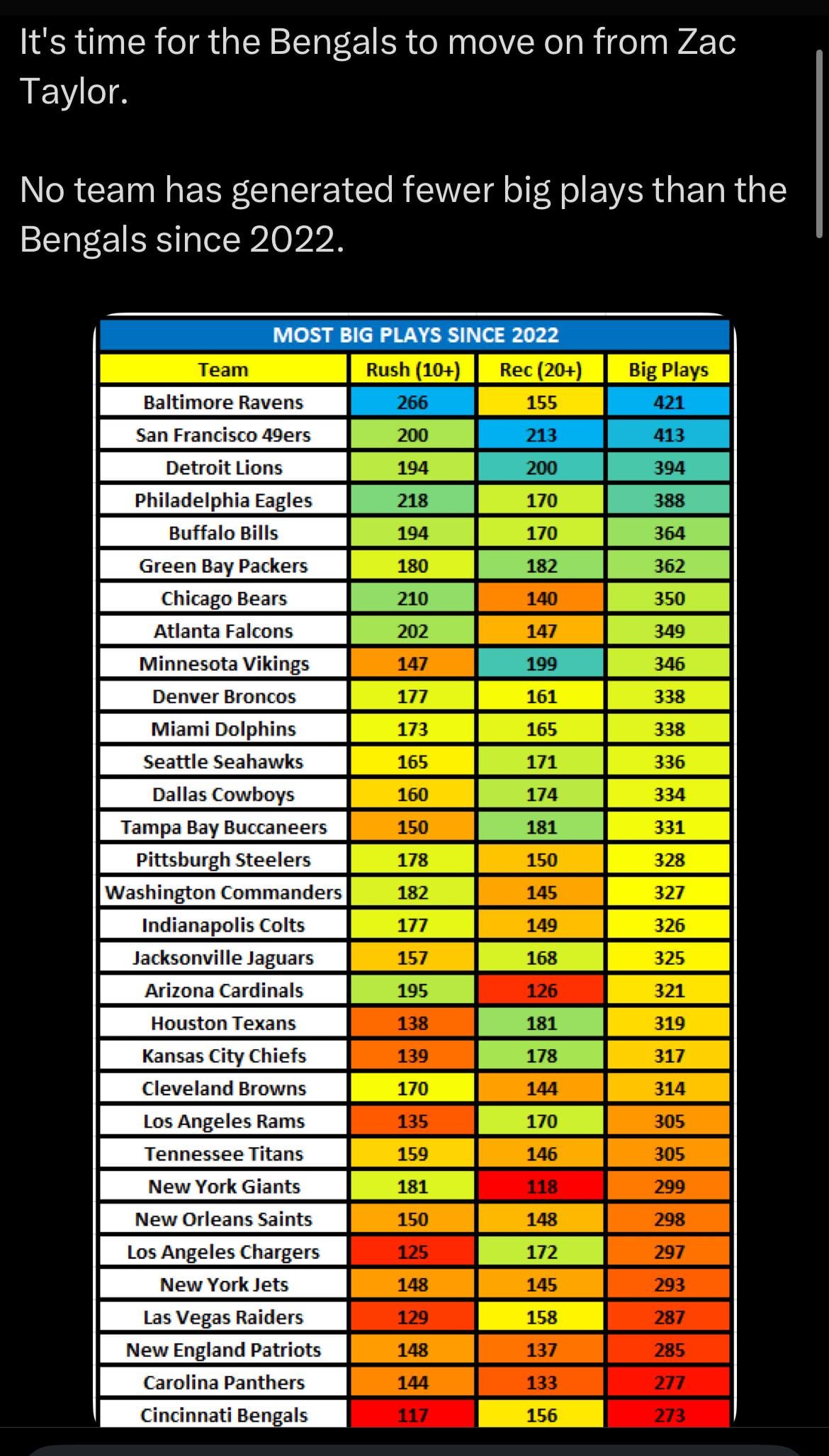 No team in the NFL has generated fewer big plays than the Bengals since 2022 (from Marcus Mosher on X)