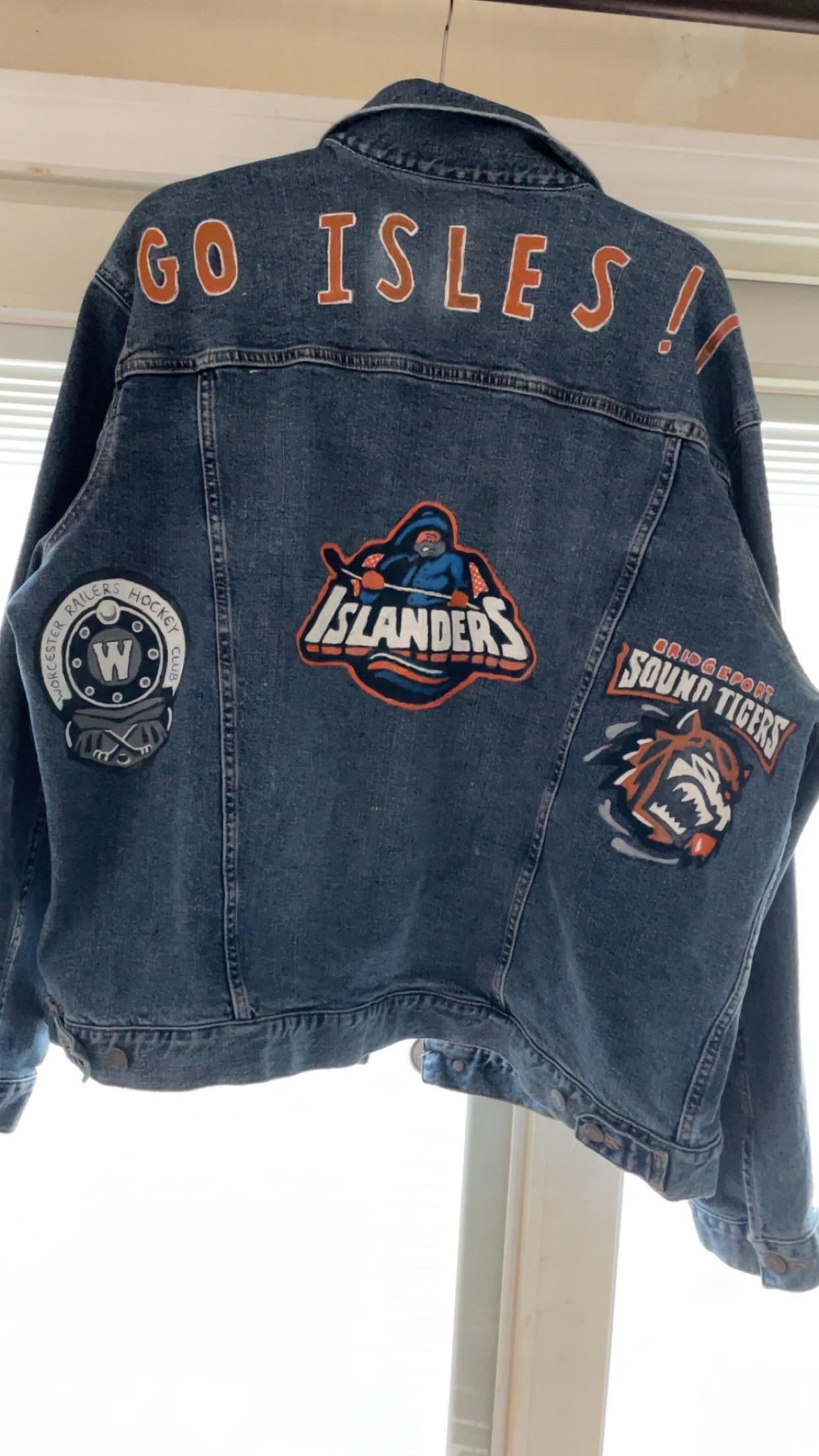 Hey everybody, with the regular season fast approaching I wanted to make a little post to show folks what I'll be wearing to Belmont Park and Bridgeport this year. It's a standard gap denim jacket acrylic painted with the logos of our NY islanders, Bridgeport sound Tigers and the Worcester railers by my mom. She worked close to 100 hours bringing this piece to life, representing our entire Islanders organization and wanted to show it off to you guys. Happy hockey season everybody, and go isles!!!