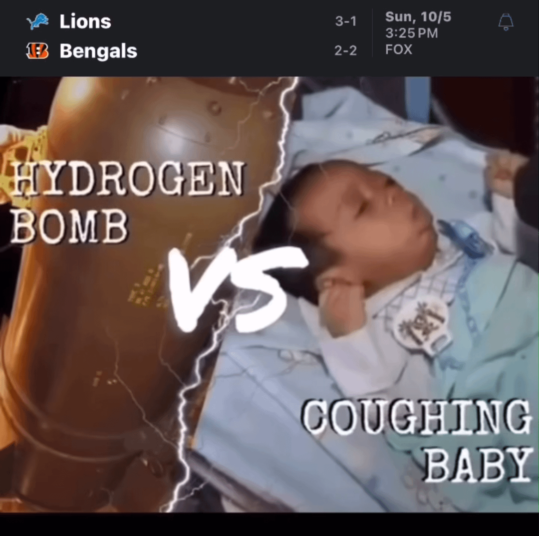 On one hand it *COULD* be a trap game but I highly doubt it. On the plus side maybe if the Lions beat the Bengals hard enough maybe Zac gets fired? I’m just saying unless Hendrickson has a god like game of multiple sacks a quarter I’ll be disappointed if it’s not 50+ by 3rd quarter.