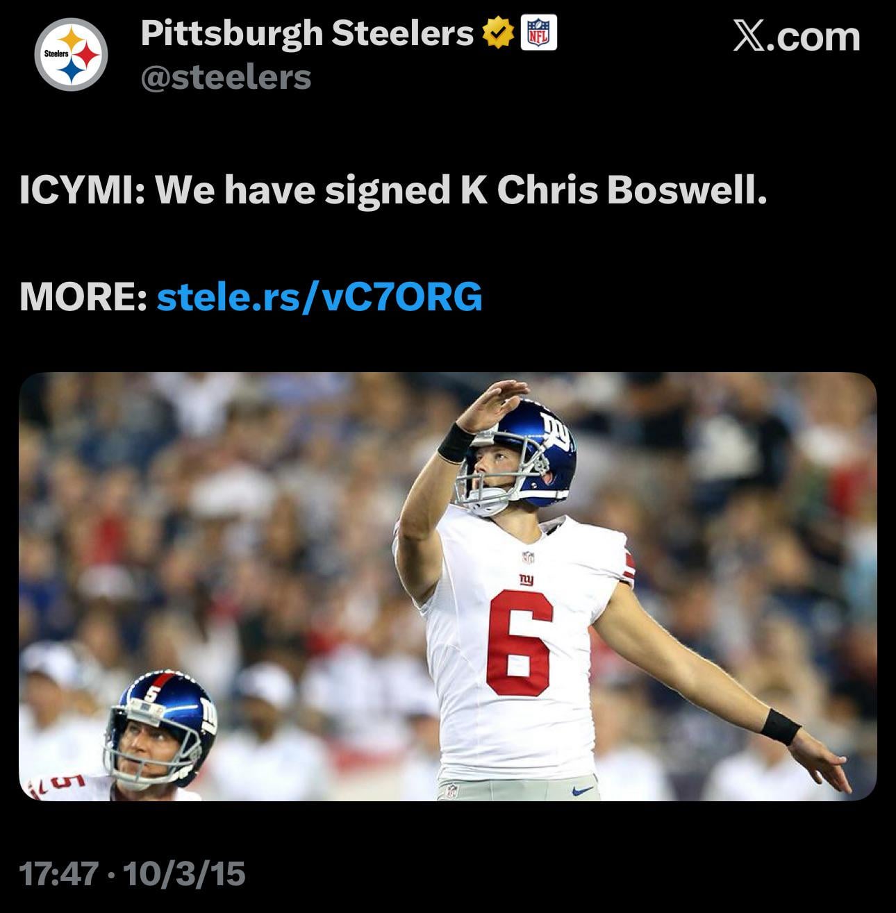 We should all be thanking Josh Scobee. He was so terrible, basically costing the Steelers two games before they decided to sign the GOAT. Crazy that Boswell was the Steelers 4th kicker that year, and now a decade later he’s become the franchise’s best kicker.