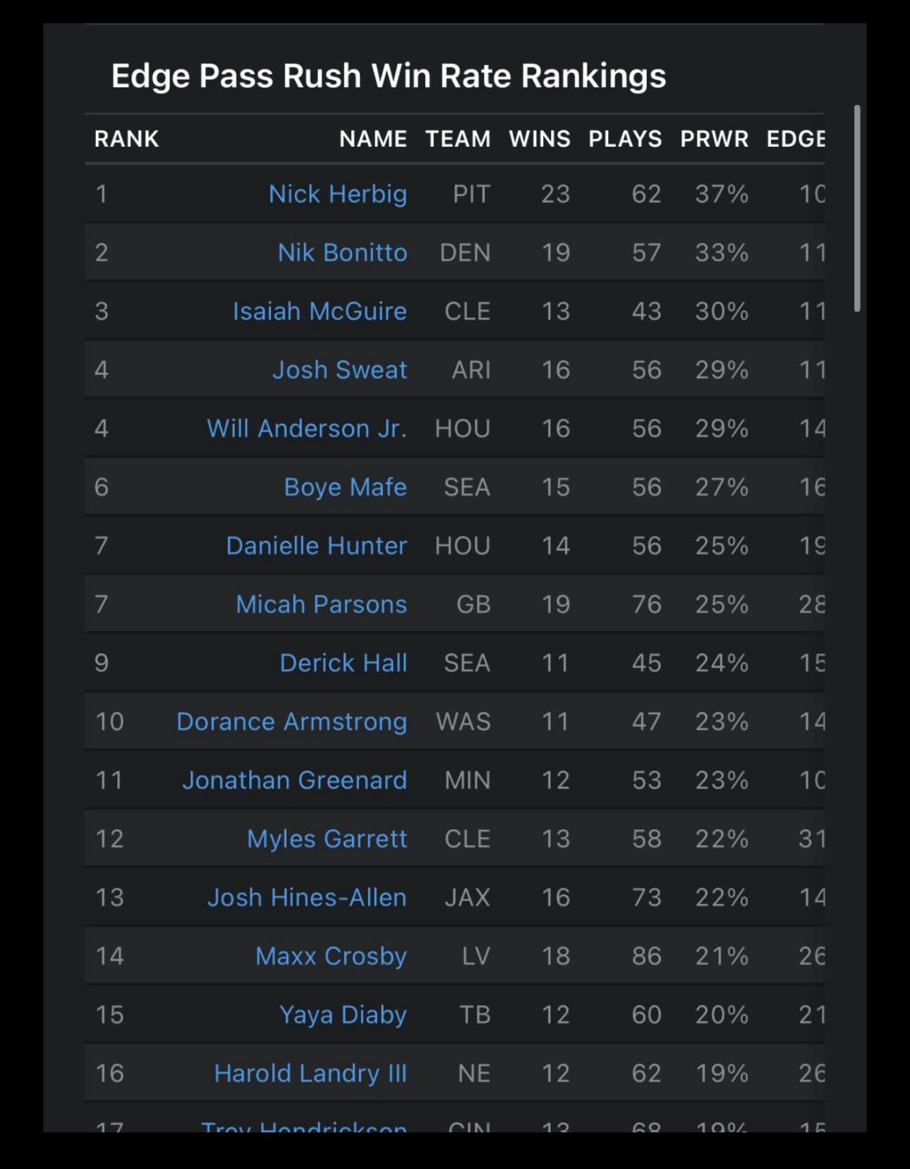 Yeah but Myles Garrett is quadruple teamed so if you multiply 13×4 you get 52 wins out of 58 plays you get a 90% win rate and he’s still DPOY.