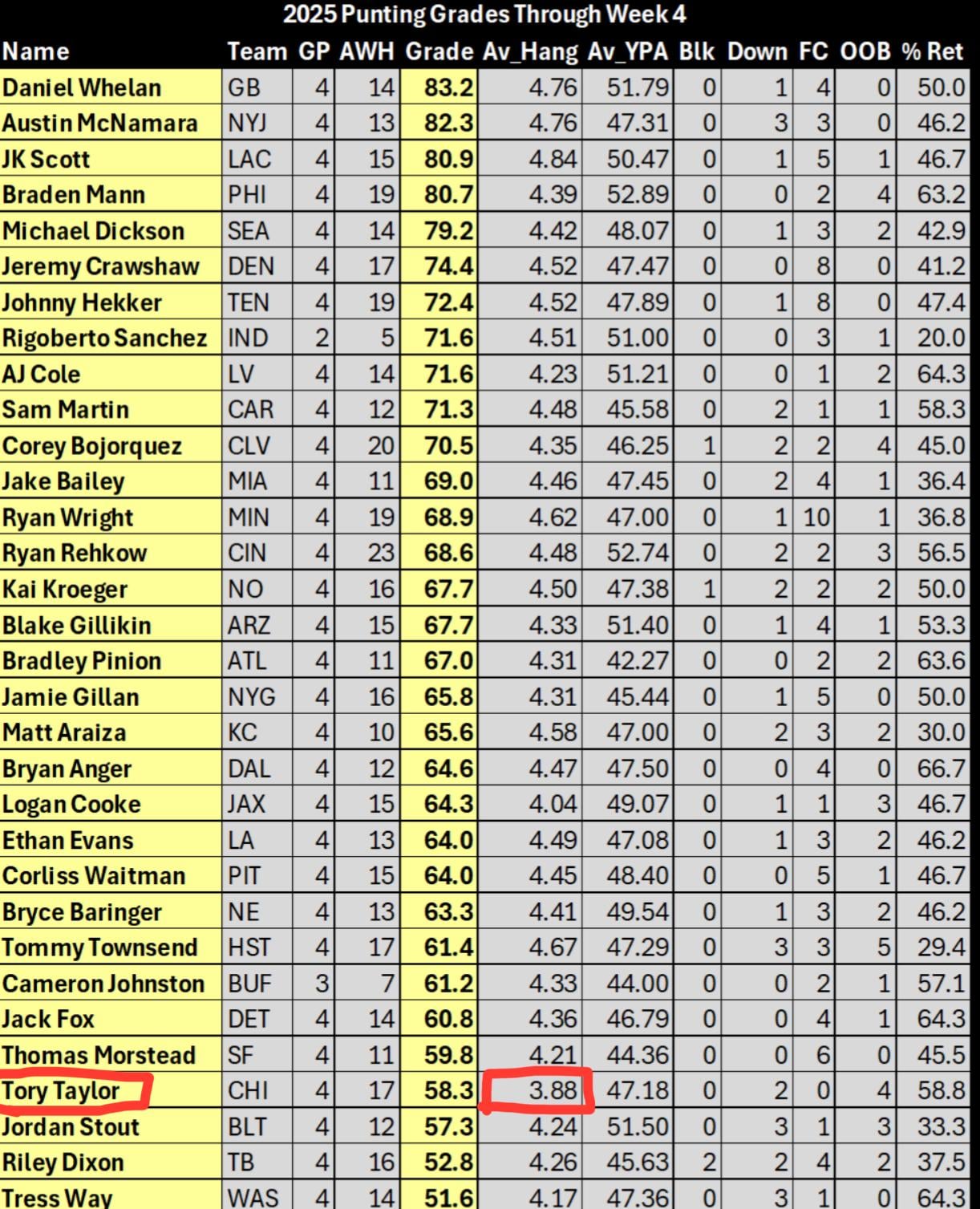 Is there a “time to kick” stat? It feels like almost every one of his punts is on the verge of being blocked. Maybe he just feels rushed or something.