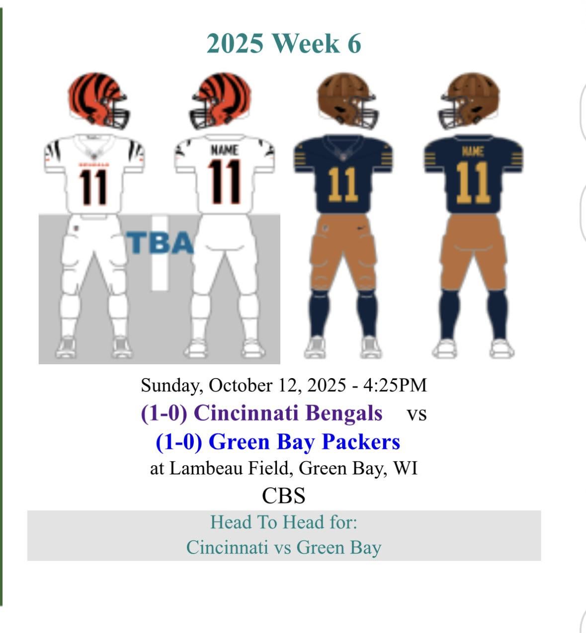 Where are you seeing that the Packers are wearing that uniform for the Bengals game? On the Packers website it says they are wearing the retro uniforms against the Panthers in Week 9