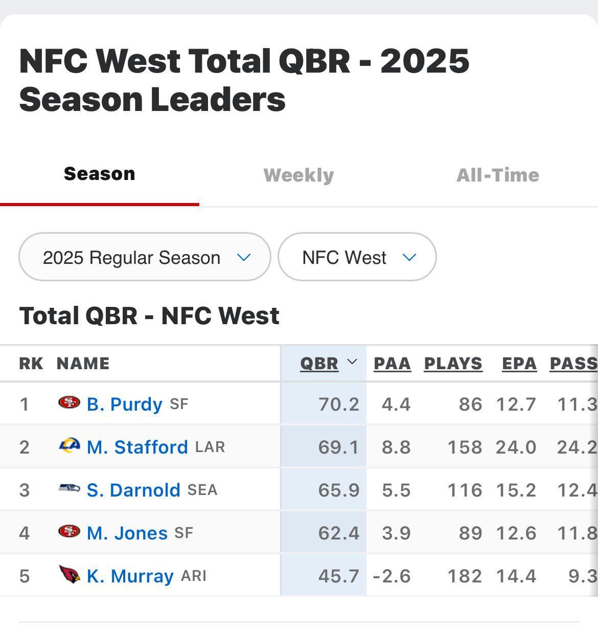 The funny part is that y’all hated his qbr rating all off-season n called it a meaningless stat. Weird change up