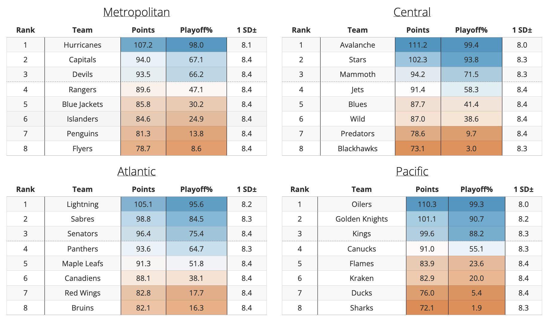 Evolving Hockey’s model thought the Sabres would make the playoffs last season as well, though they were the only model that thought so iirc. This year three (EH, HockeyViz, and Jfresh) of the four (Dom’s) major public models think the Sabres will make the playoffs (though for what it’s worth Vegas, which is supposed to be the smart money, doesn’t think they will). The real saving grace for the Sabres is how ass the five through eight teams are likely to be plus Florida missing Barkov and Tkachuk for a significant amount of time.