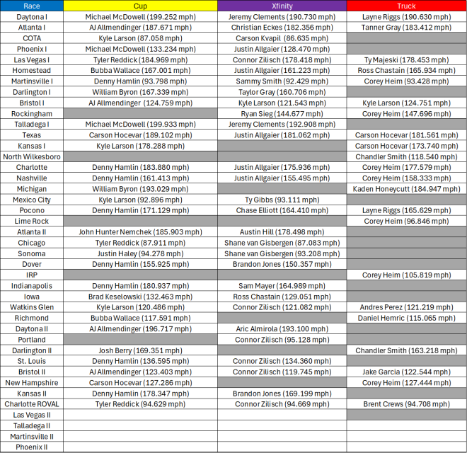 Of the 83 race winners, 20 of them went on to earn the fastest lap bonus. Seven of the 20 winners scored the maximum 61 points (race win, two stage wins & the fastest lap): Kyle Larson in the Cup race at Kansas, Larson in the Xfinity race at Bristol, Justin Allgaier in the Xfinity race at Nashville, Connor Zilisch in the Xfinity race at Portland and Corey Heim in the Truck races at Charlotte, Lime Rock and New Hampshire.