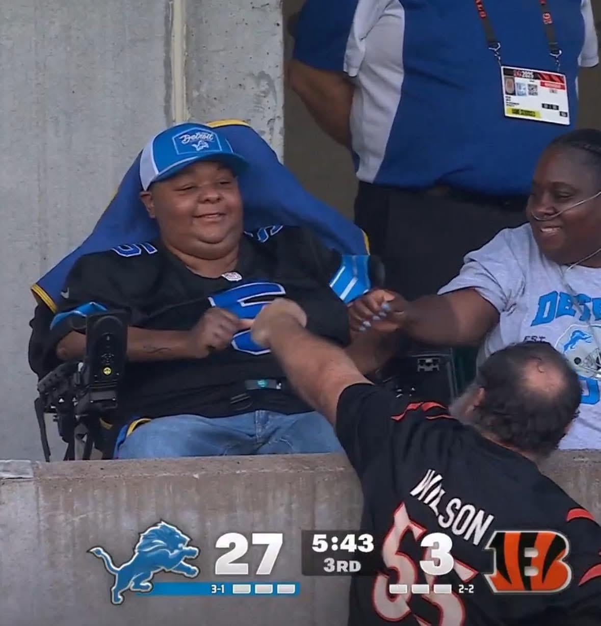 Context: That’s Lion RB David Montgomery’s sister, Kiki, smiling in the stands-her first time seeing him play in person since a devastating 2024 car accident left her paralyzed from the neck down.