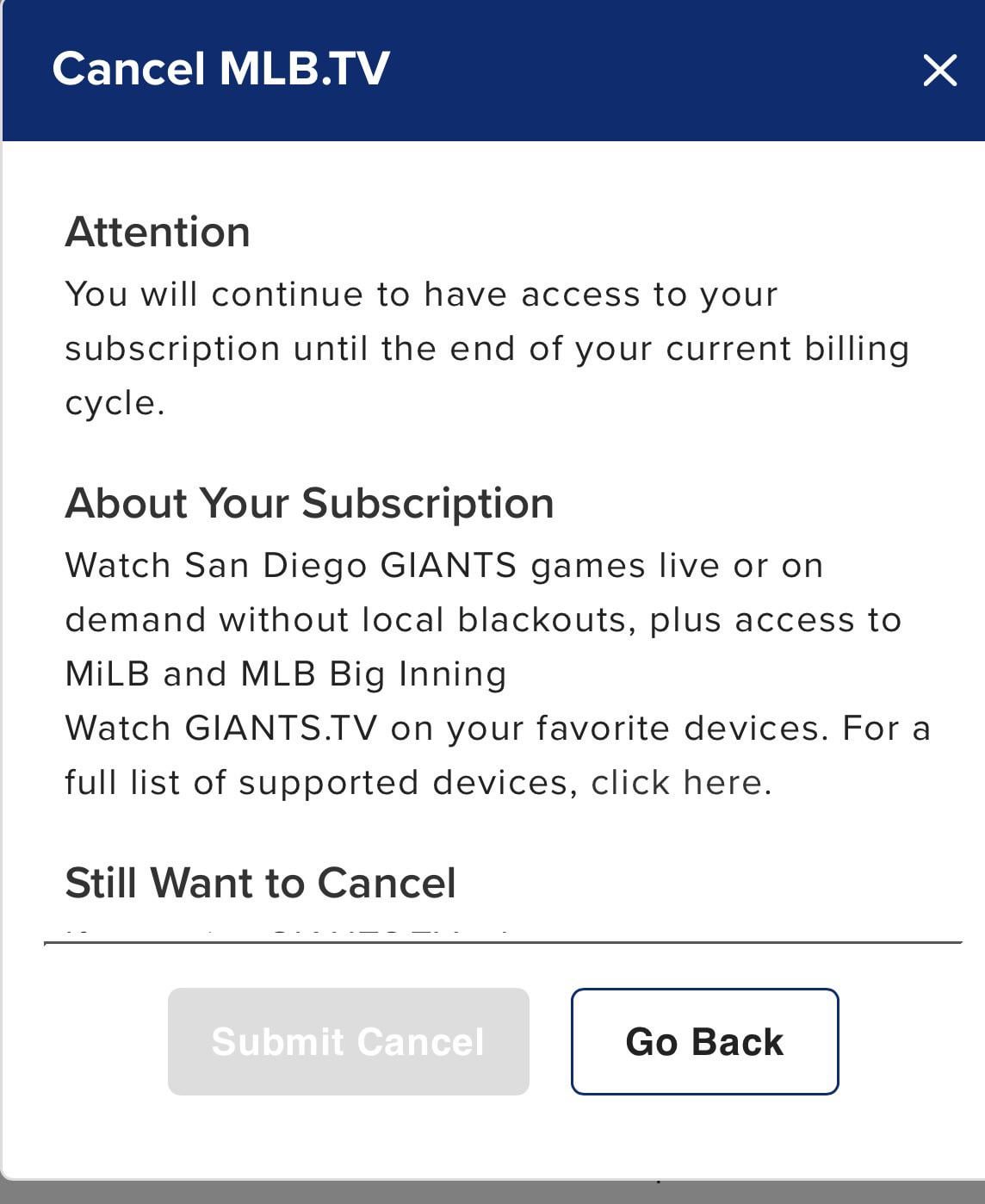 3. I had the same SD Giants message. It wouldn’t let me cancel on here. I had to cancel on a desktop as “submit cancel” stayed grayed out on IOS. Good to see they’re on top of fixing their shit as this was months that ago I canceled