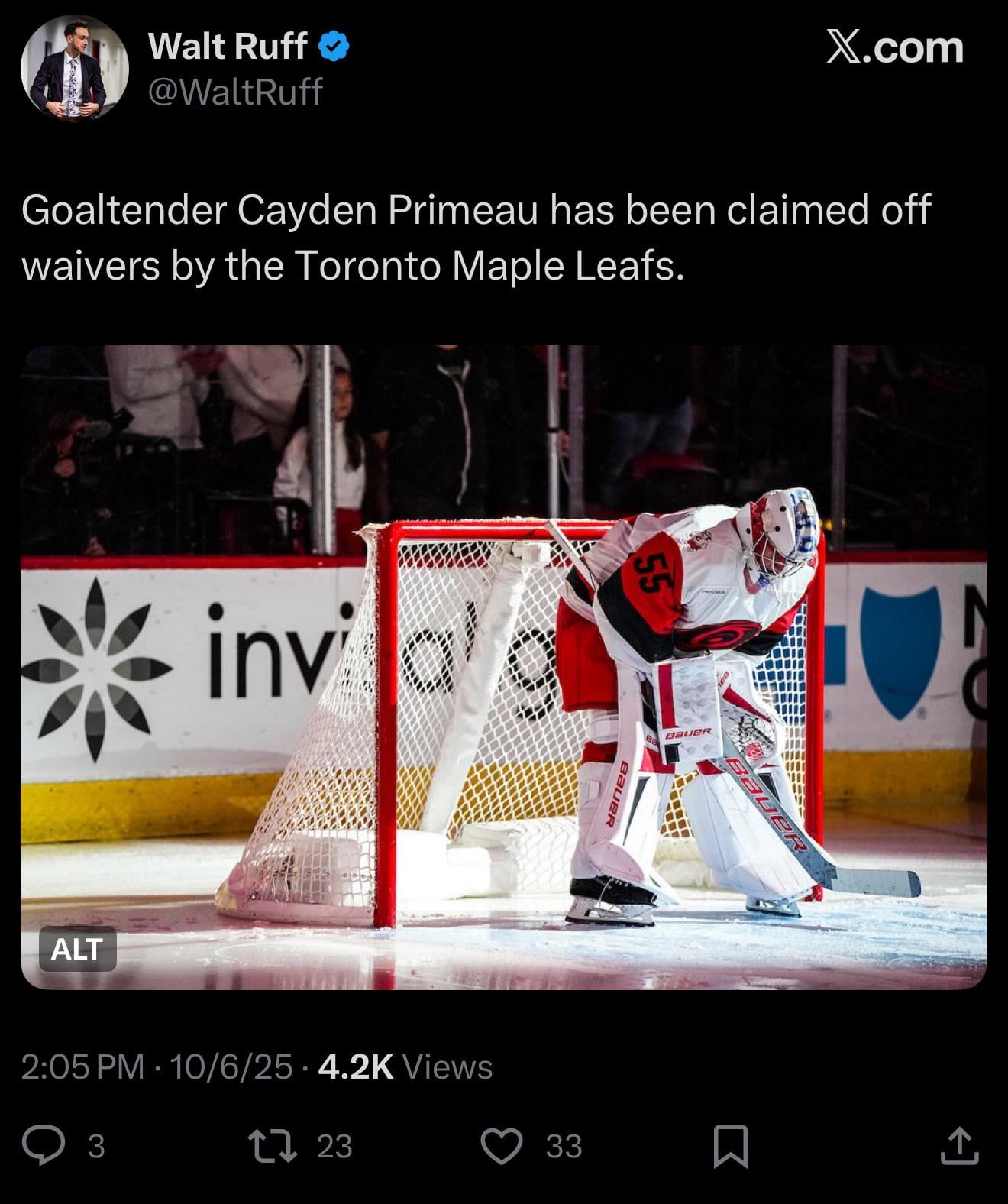 Okay so what was the FO expecting, and what do they expect to do now with Bussi? Genuine question, bc Primeau seemed like a solid 3rd goalie with previous NHL success