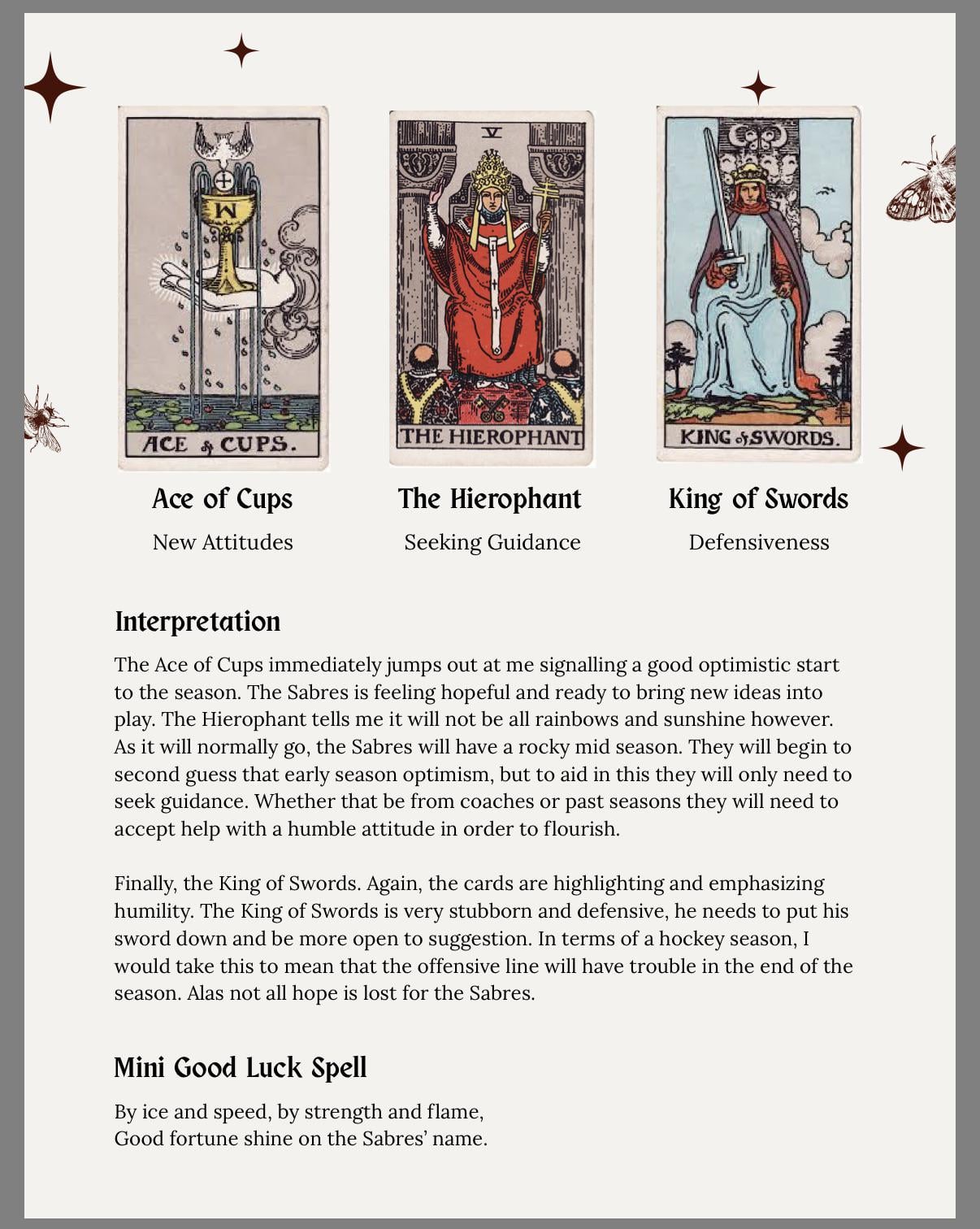 I had to go to tarot cards to see how this season will pan out.