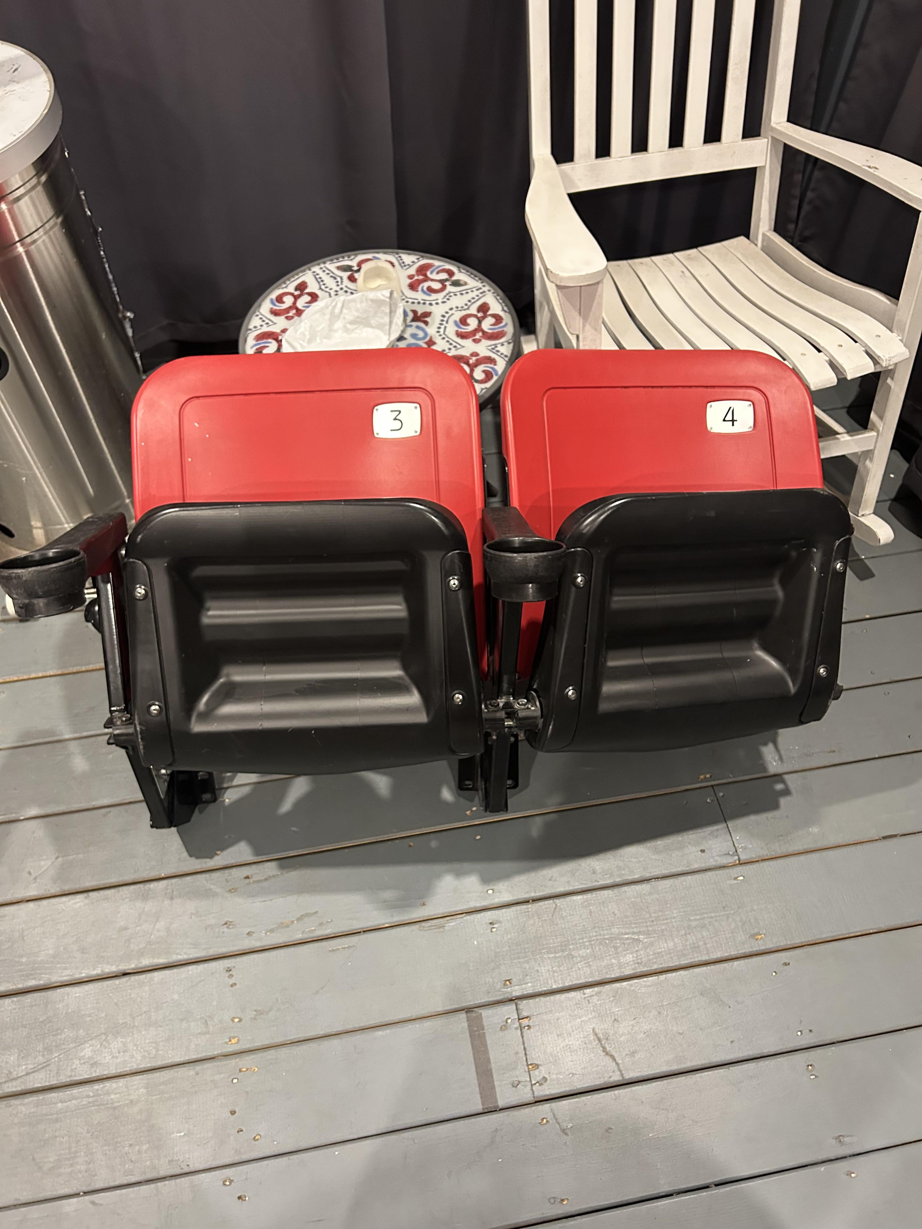 You have an opportunity to make the coolest spot to watch the game. You need to build a platform to bolt them to. Something cool, like a mini version of the home ice. You have to add a little extra space for your mini fridge in between the two seats. I might even suggest figuring out how to make the fridge look like a zamboni driving between the two seats. Then you put “glass” along the back and sides to give you 3/4 coverage of your new mini rink. Lastly, lights and horn with a goal button that makes all of it go crazy. If you can add a recliner like foot rest to the seats, that would be even more ideal. I’ll be waiting for the results…..