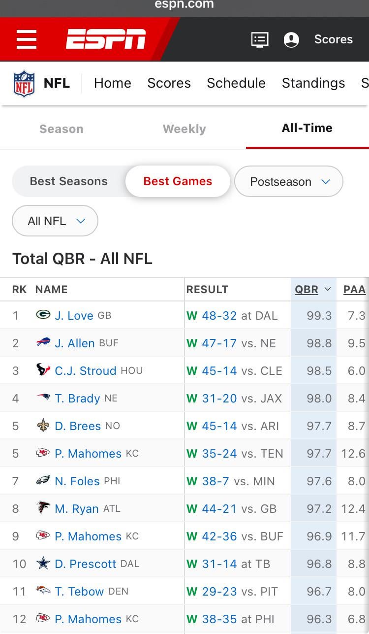 Honestly shocked Rodgers vs the Falcons W en route to the Super Bowl isn’t in the top 10. That was the best game I’ve ever seen a QB play