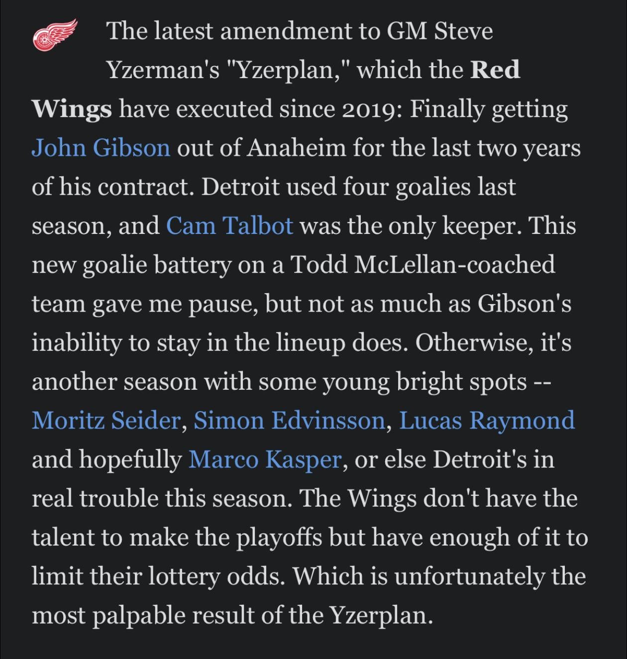 Larkin, Raymond, Kane, DeBrincat, and Kasper are a solid top 6 group. Seider is a stud and Edvinsson is already a top 2 defensemen and one of the best young ones in the game. Expect Johansson to take a step and you have ASP as a wildcard. Plus you add in Gibson and the rookies’ potential.