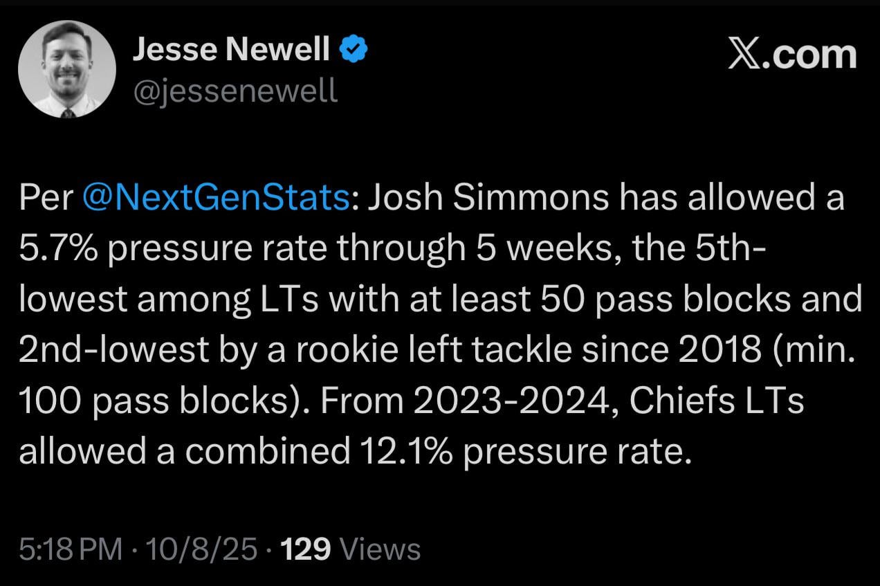 [Jesse Newell] Per @NextGenStats: Josh Simmons has allowed a 5.7% pressure rate through 5 weeks, the 5th-lowest among LTs with at least 50 pass blocks and 2nd-lowest by a rookie left tackle since 2018 (min. 100 pass blocks). From 2023-2024, Chiefs LTs allowed a combined 12.1% pressure rate.