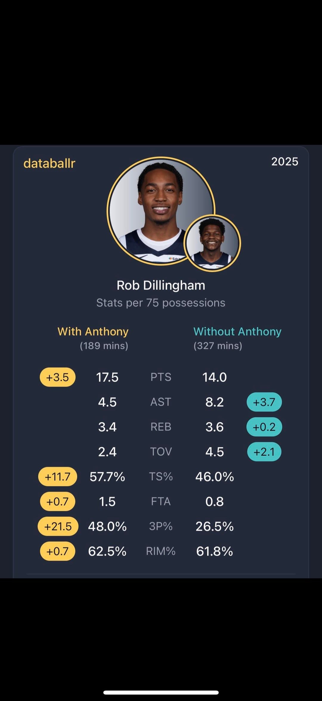 I would hope he’s more efficient when Edwards is on the court, considering Ant is practically doubled 80% of the time.