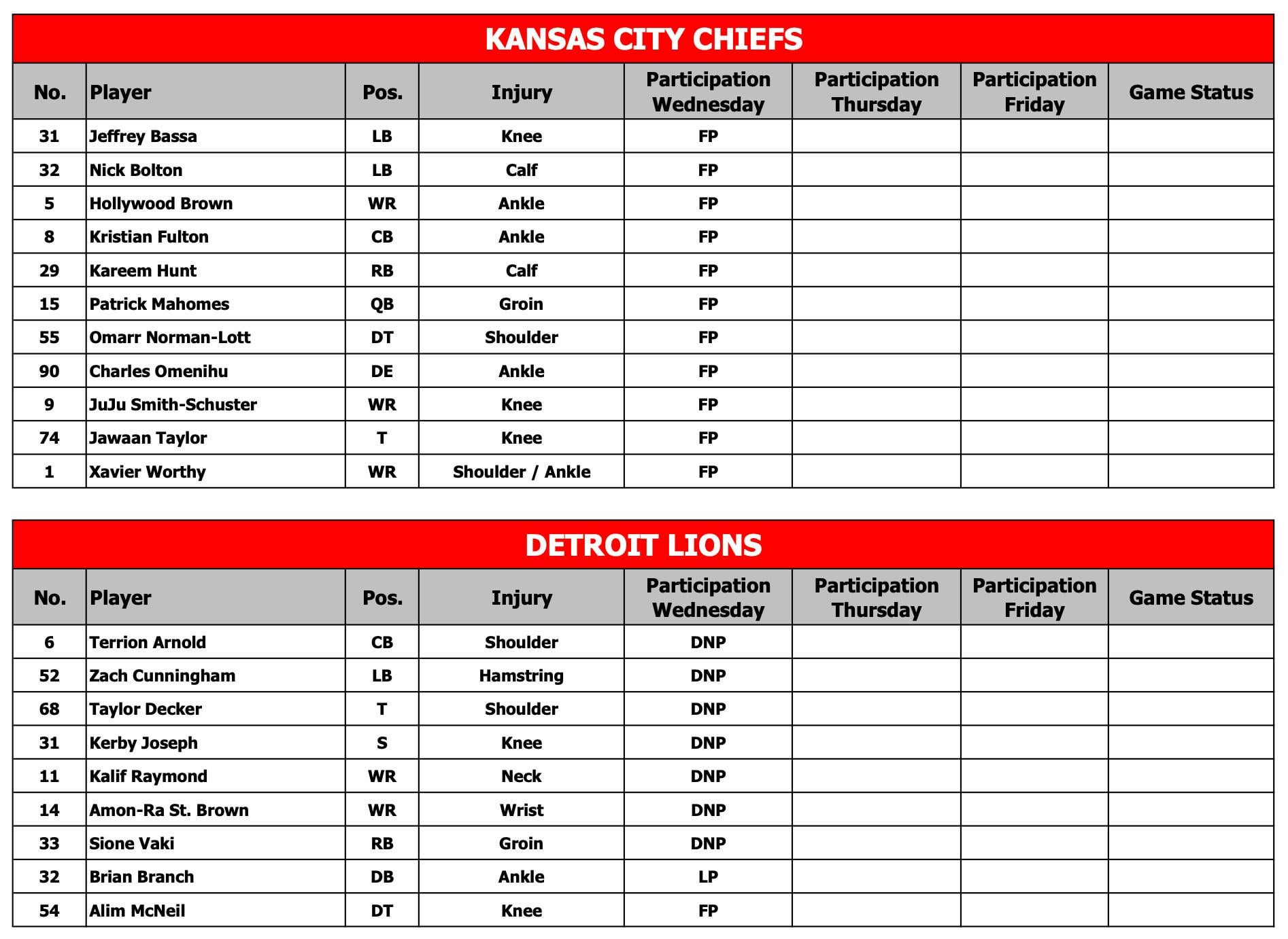 [McMullen] Full Wednesday injury report: Everybody- including Fulton and ONL- was a full participant 9 comments [Source](https://bsky.app/profile/kcchiefsmatt.bsky.social/post/3m2pj47utzc2j) I’ve seen that before. Fulton will tweak something Friday ONL seems to be injured a lot so far. As long as conner isnt in the fucking slot Please god keep kerby Joseph out, I would like for Kelces knees to not be sideways How are we so healthy and yet so bad at winning these games Sun God did not participate.. Dudes day for Lions I was beginning to think Fulton didn’t even exist. Leave a ReplyYou must be logged in to post a comment.